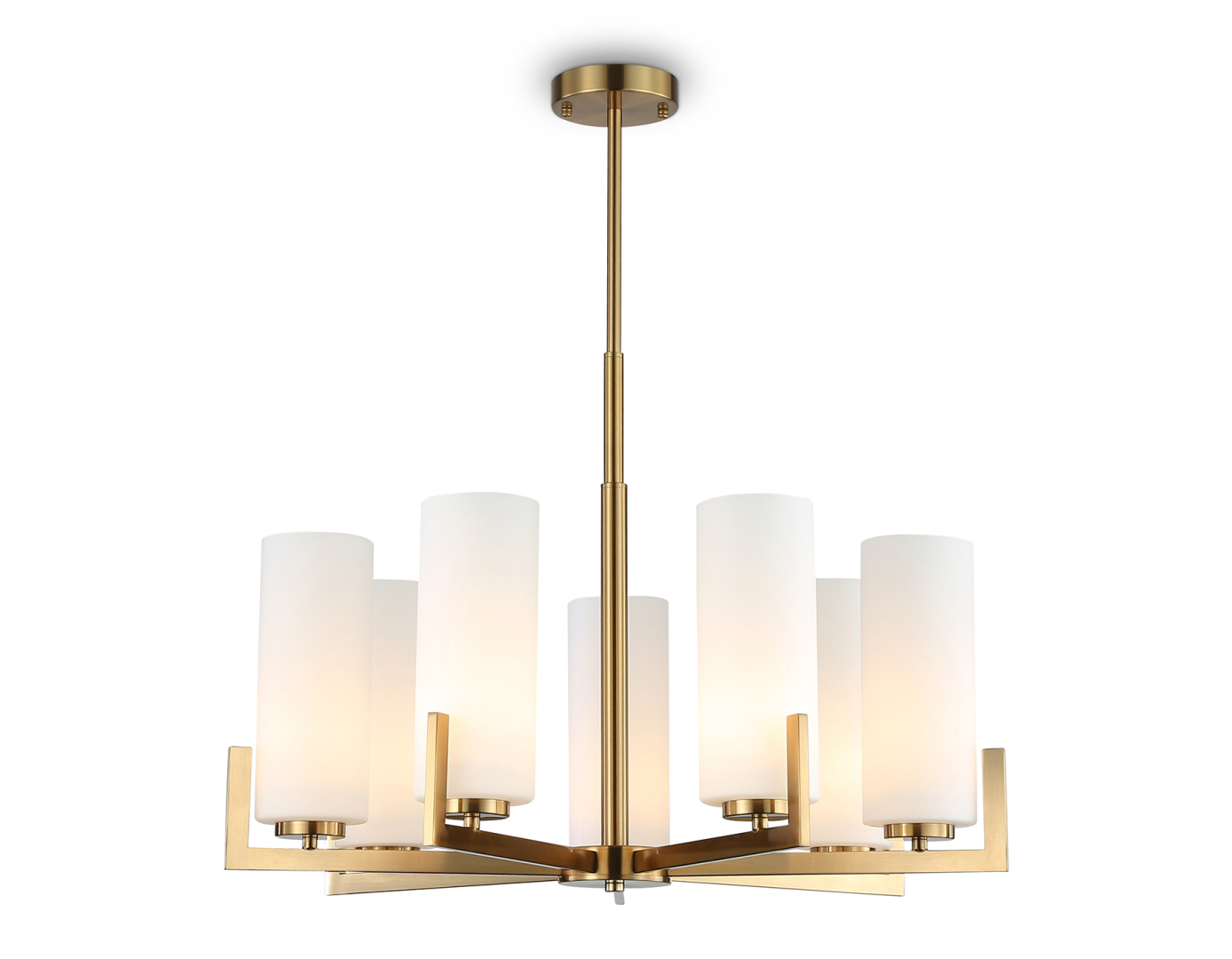 Люстра на штанге из коллекции HIGH LIGHT. Модель LH56064 представлена в современном стиле модерн. Светильник выполнен из металлического каркаса цвета латунь и белых стеклянных плафонов. Для данной модели подойдет сменная лампа с цоколем Е27. Светильник будет прекрасным дополнением в любом помещении.