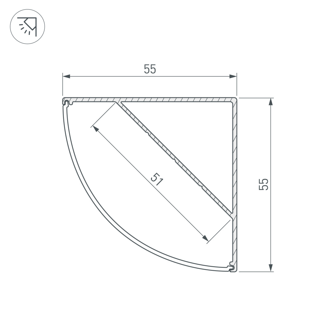 Алюминиевый анодированный угловой профиль для светодиодных лент и линеек. Габаритные размеры (L×W×H): 2000x55x55 мм. Ширина площадки для ленты 51 мм. Экраны, заглушки и другие аксессуары приобретаются отдельно. Цена за 1 метр.