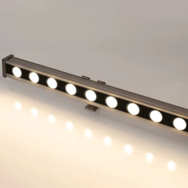 Линейный прожектор. Мощность 24 Вт, св. поток 1920 лм, 80 лм/Вт, дневной 4000 K, CRI>80, угол 15°, напряжение питания 230 В. Серый прямоугольный корпус из алюминия, экран стекло, степень защиты IP65. Размер: длина 1000 мм, ширина 40 мм, высота 30 мм. Монтаж на кронштейнах.