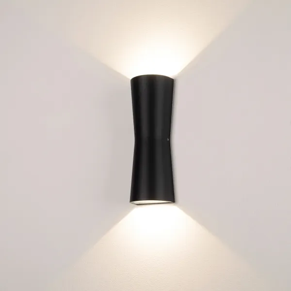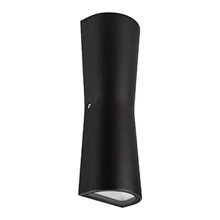 Светодиодный светильник для наружной подсветки стен, свет вверх-вниз. Цвет ТЕПЛЫЙ БЕЛЫЙ 3000К, 855Лм, светодиоды 2x6Вт Cree 1304, угол 97°. Влагозащищенный корпус IP54 - черный алюминий, экран закалённое стекло. Питание 230В, мощность 12 Вт. Размеры ДхШхВ -260х90х60 мм.