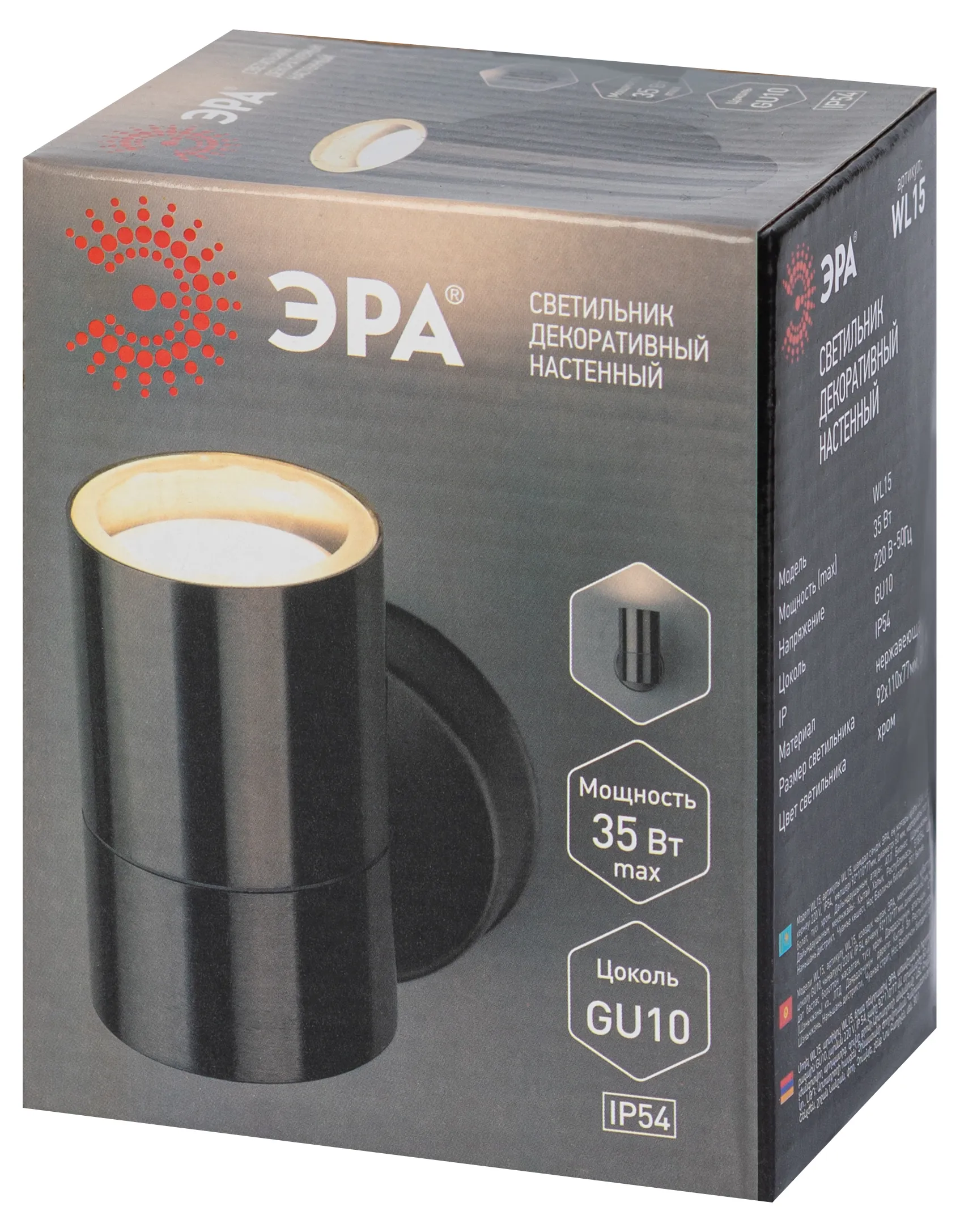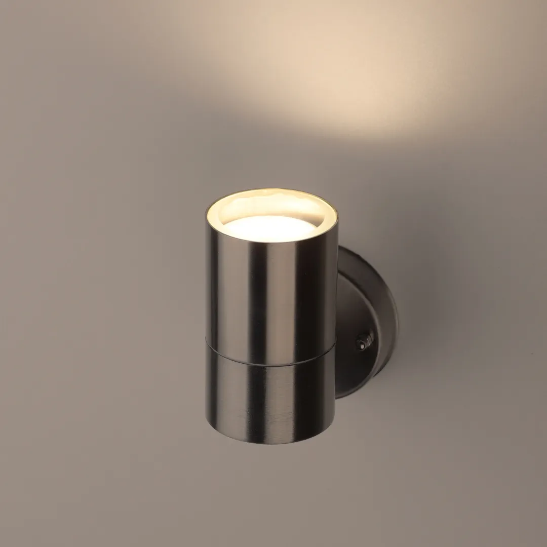 Светильник декоративный настенный WL14 создает интересные световые композиции, подчеркивает структуру материалов. Подходит для наружного уличного освещения. Цоколь для источника света GU10, напряжение питания 220В ~50/60Гц, материал нержавеющая сталь/стекло, цвет светильника хром, размер 77*180 мм, D60 мм, максимальная мощность лампы 50 Вт, степень защиты IP44