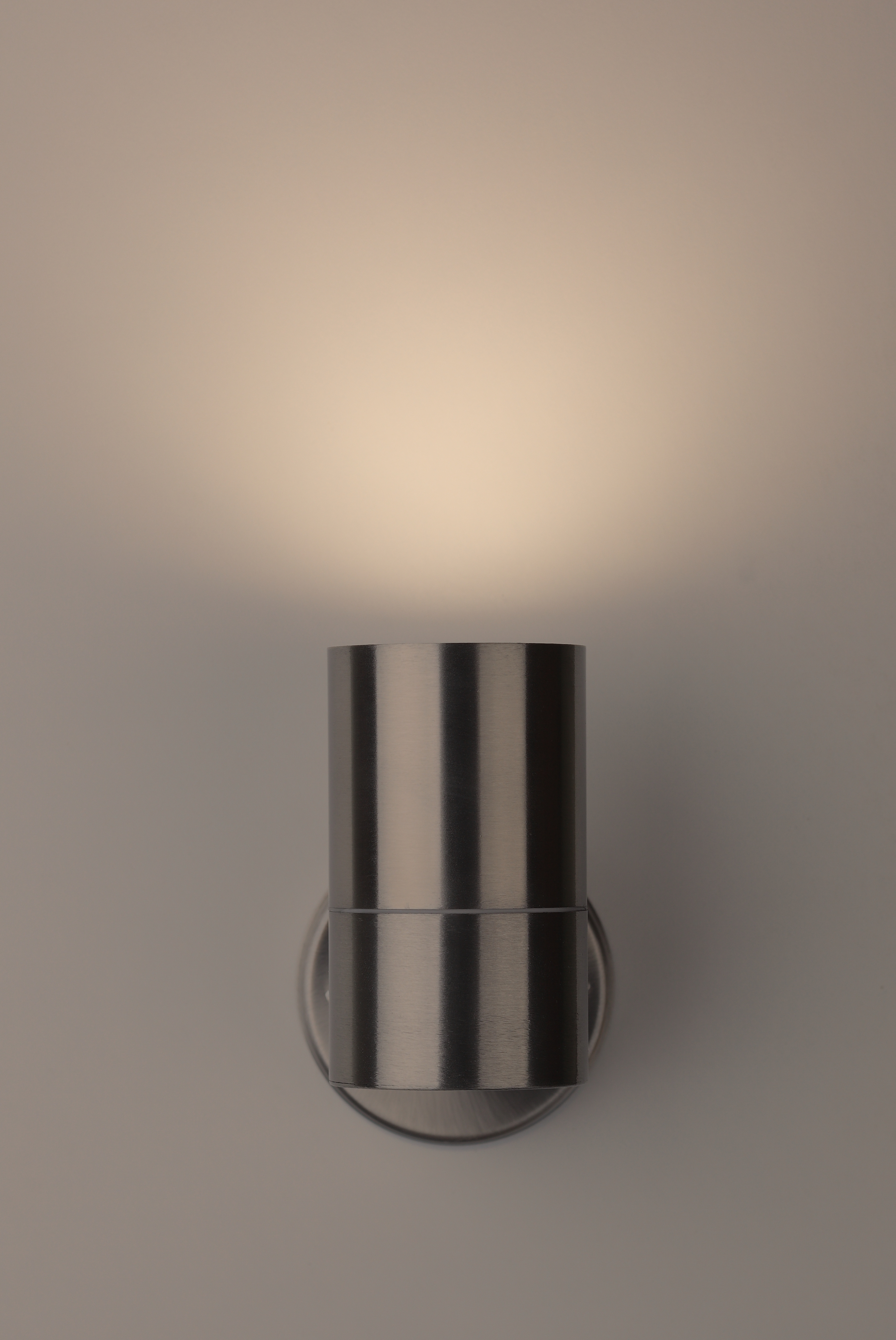 Светильник декоративный настенный WL15 создает интересные световые композиции, подчеркивает структуру материалов. Подходит для наружного уличного освещения и влажных помещений. Цоколь для источника света GU10, напряжение питания 220В ~50/60Гц, материал нержавеющая сталь/стекло, цвет светильника хром, размер 92*110*77 мм, D60 мм, максимальная мощность лампы 50 Вт, степень защиты IP44