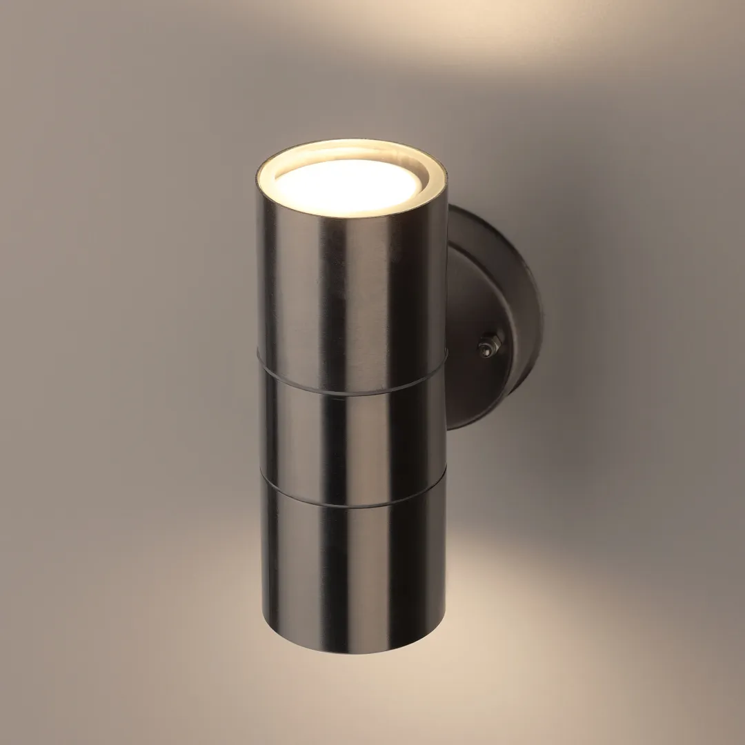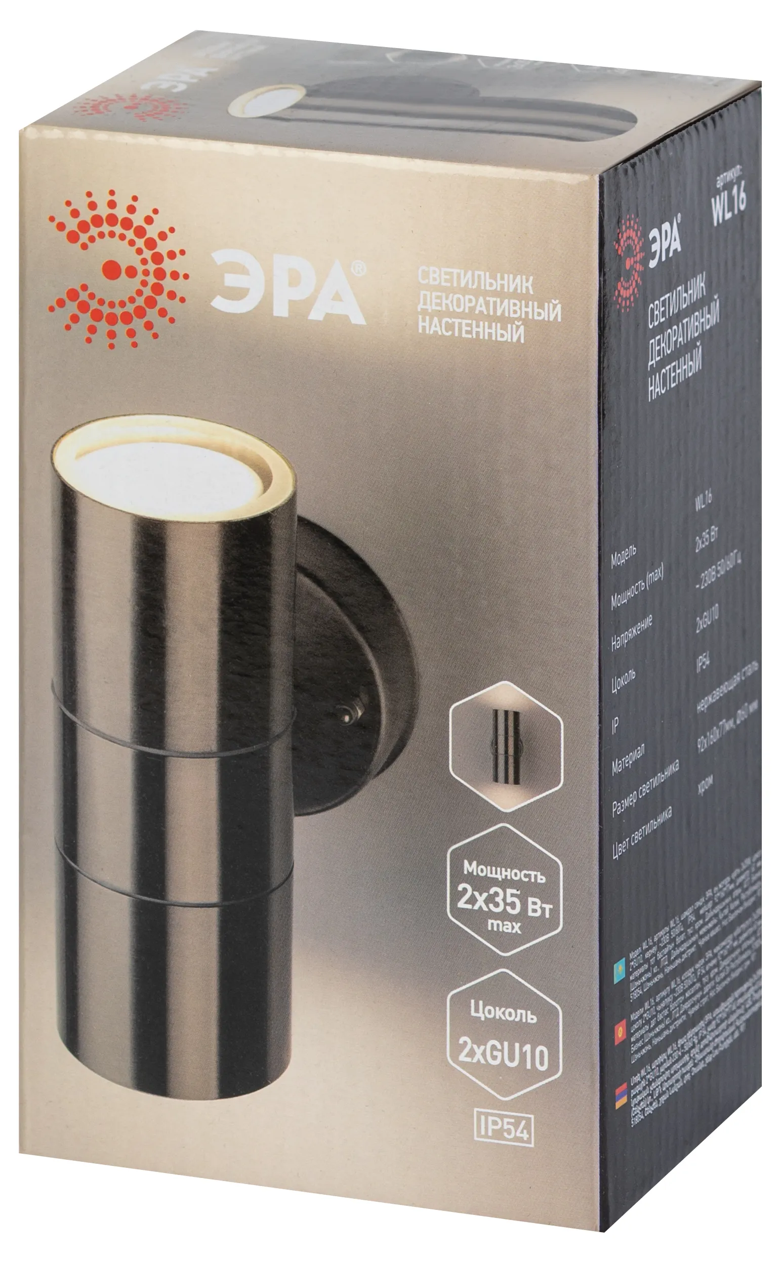 Светильник декоративный настенный WL16 создает интересные световые композиции, подчеркивает структуру материалов. Подходит для наружного уличного освещения и влажных помещений. Цоколь для источника света GU10, напряжение питания 220В ~50/60Гц, материал нержавеющая сталь + пластик, цвет светильника хром, размер 92*160*77 мм, D60 мм, максимальная мощность лампы 50 Вт, степень защиты IP44