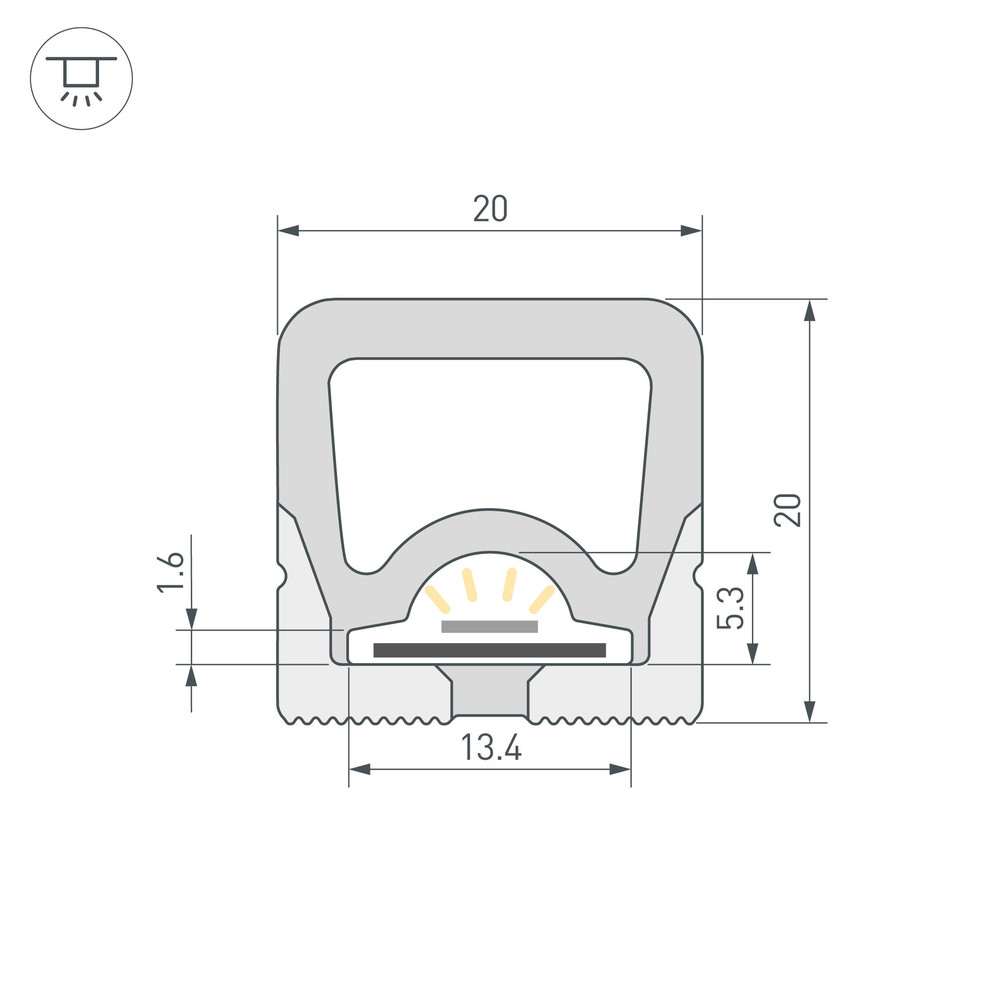 Цельнолитой силиконовый гибкий профиль, белый матовый. Габаритные размеры 5000×20×20 мм. Вертикальный изгиб TOP, минимальный радиус изгиба 60 мм. Для установки во влажных помещениях необходима герметизация при помощи двухкомпонентного эпоксидного герметика. Класс пылевлагозащиты – IP65 (при соблюдении технологии герметизации). Для лент шириной от 10 до 12 мм, высотой до 4 мм и мощностью до 10 Вт/м. Угол излучения 140°. Поставляется в катушках по 5 м. Цена за 1 м.
