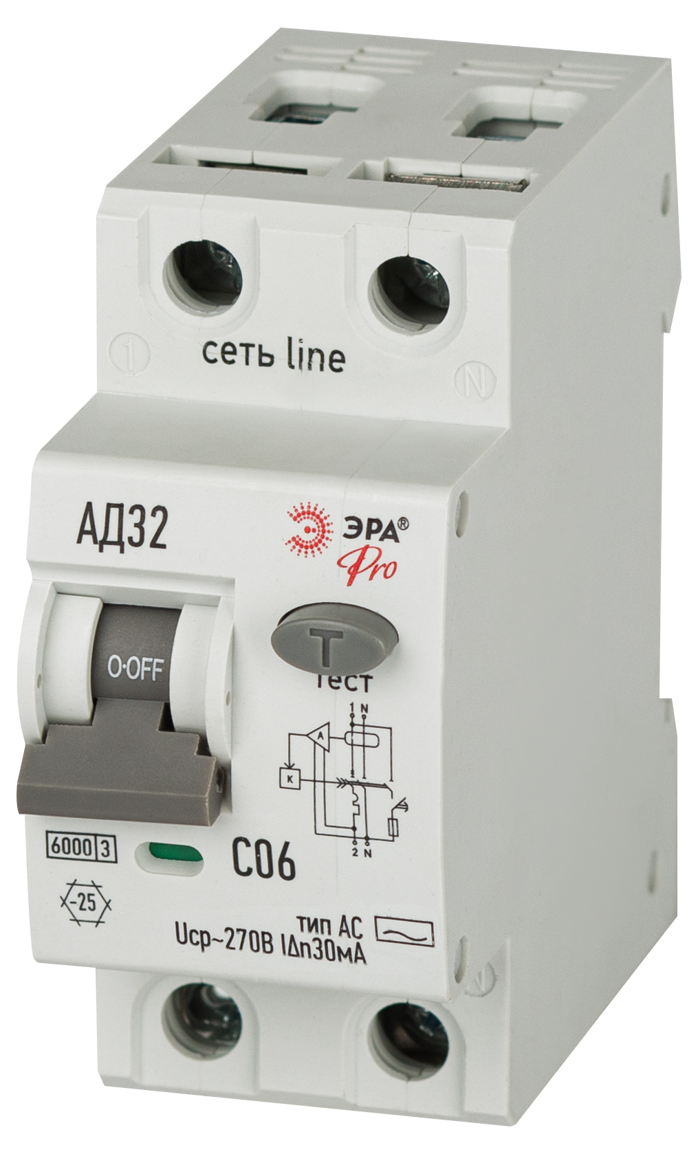 Автоматический выключатель дифференциального тока ЭРА АД-32 линейки Pro. Профессиональные АВДТ ЭРА защищают человека от поражения электрическим током при повреждении изоляции электроустановок, предотвращают пожары вследствие протекания токов утечки на землю, предохраняют от перегрузки и короткого замыкания. Рекомендуются для защиты групповых линий, питающих розетки наружной установки, розеток и освещения подвалов и гаражей. Современное решение для квартирных щитков и промышленного применения.