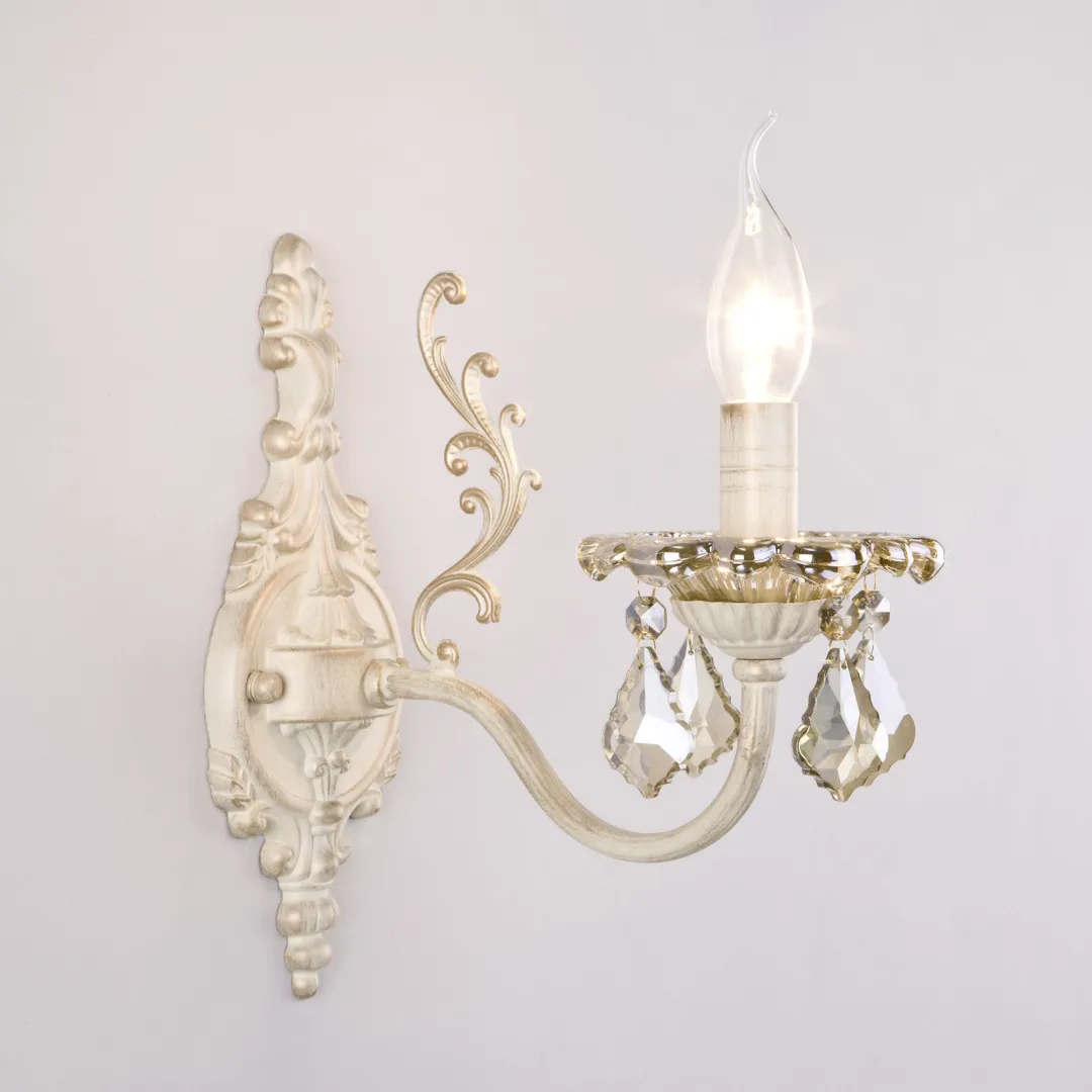 Бра с тонированным хрусталем 3281/1 белый с золотом/тонированный хрусталь Strotskis станет ярким световым акцентом в классических интерьерах и создаст качественное освещение на площади 5 м². Изящные чаши подсвечников украшены хрустальными подвесками, которые искрятся в лучах света, наполняя помещение выразительным блеском. В качестве источника света используются сменные лампы типа свеча на ветру с цоколем E14.