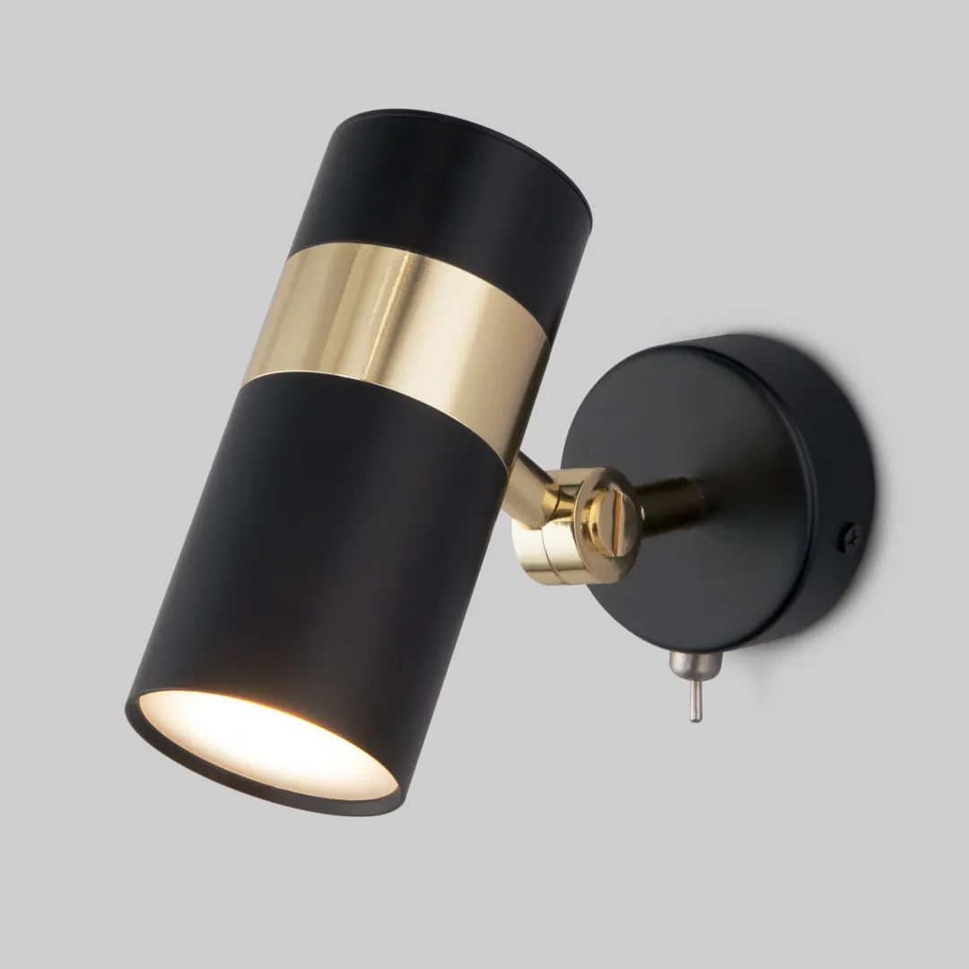 Настенный светильник с выключателем 20096/1 черный/золото создаст качественное дополнительное освещение и станет ярким дополнением к основному источнику света. Благодаря поворотному металлическому плафону можно направлять световой поток в нужном направлении. В качестве источника света используются сменные лампы с цоколем GU10. Патрон рассчитан на максимальную мощность ламп накаливания 35 Вт.