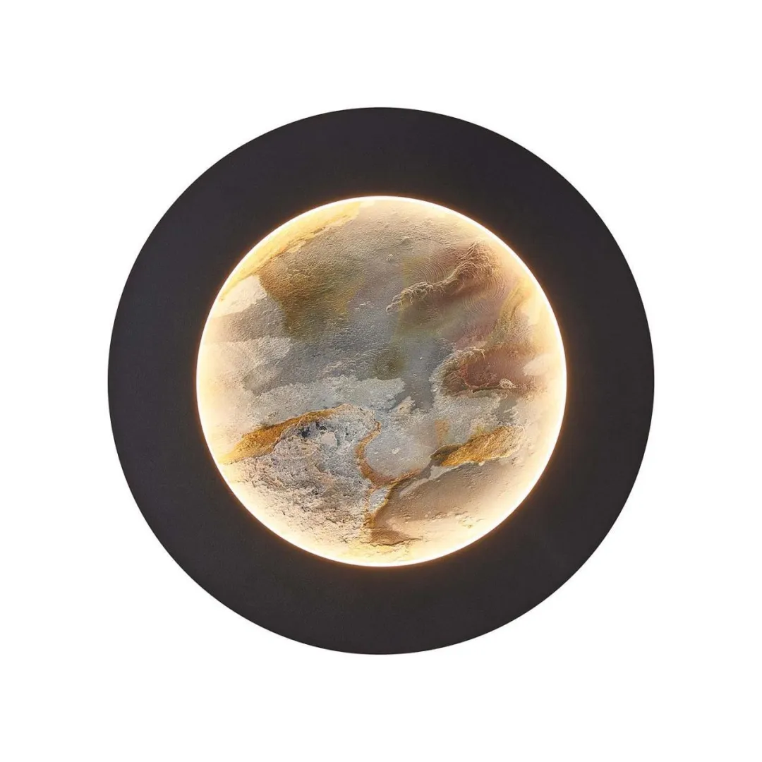Металлический каркас в матовом черном цвете, белый рассеивать из акрила, лента LED по периметру декоративного диска из натурального камня "зеленый песчаник" и на задней поверхности.