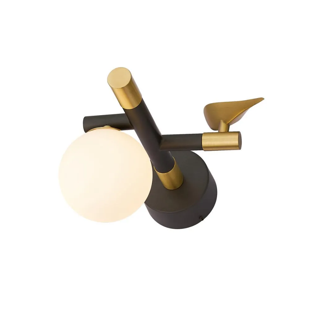 Бра с черным матовый каркасом, круглый белый плафон выполненный из выдувного стекла, золотой декоративный элемент в виде птицы.