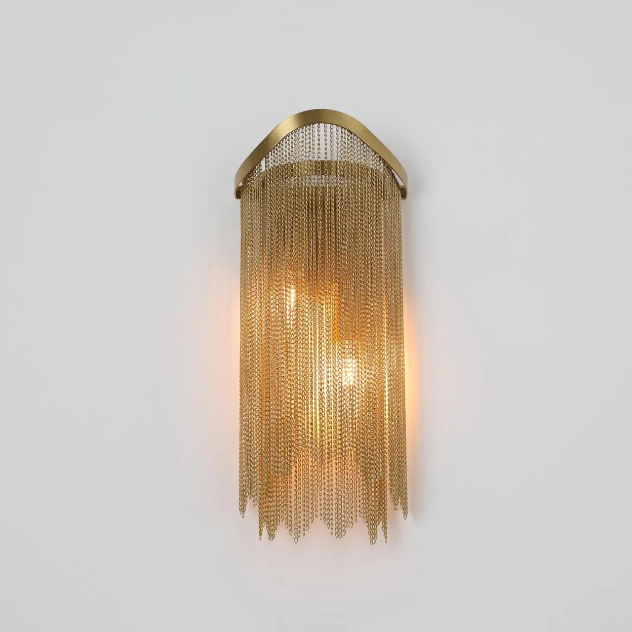 бра выполнен из полотна цепочек, каркас в цвете латунь, по внутреннему периметру плафона встроенная лента LED, регулируемая высота.