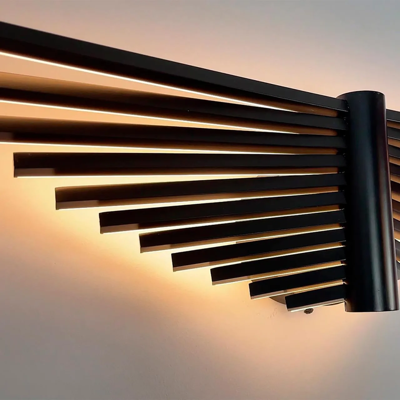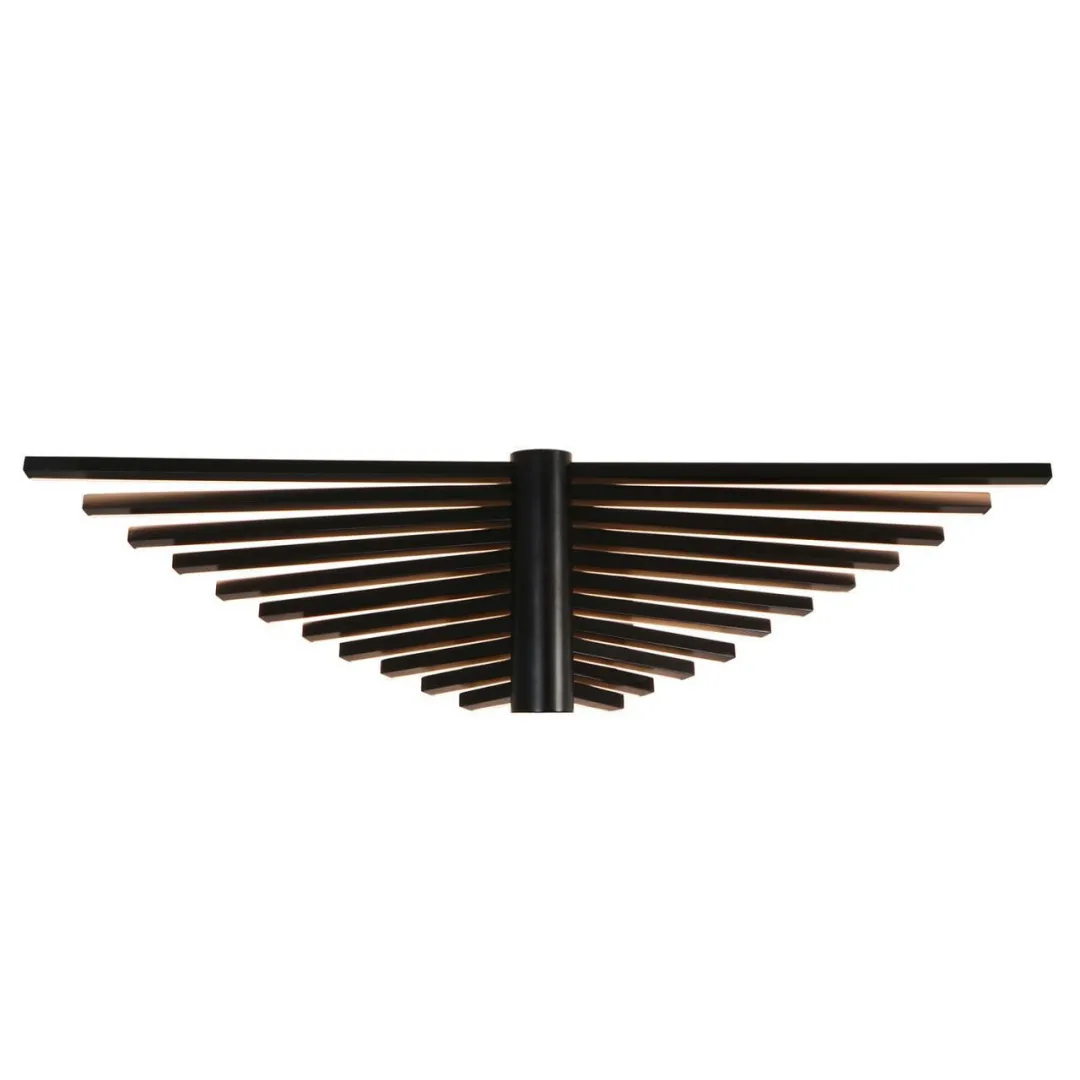Металлический каркас черного матового цвета, конструкция в виде распахнутых крыльев, состоящих из тонких металлических планок со встроенными LEDлентами.