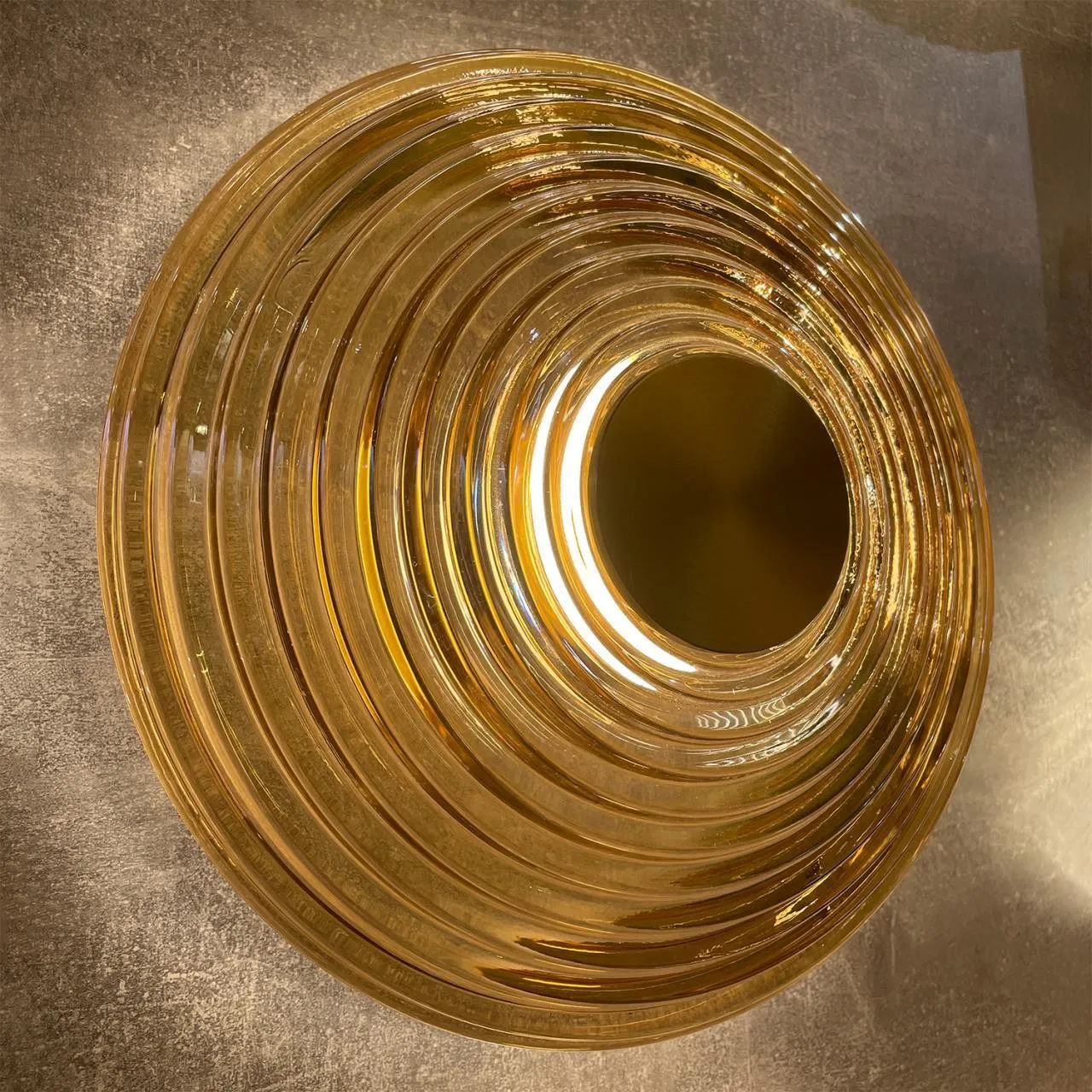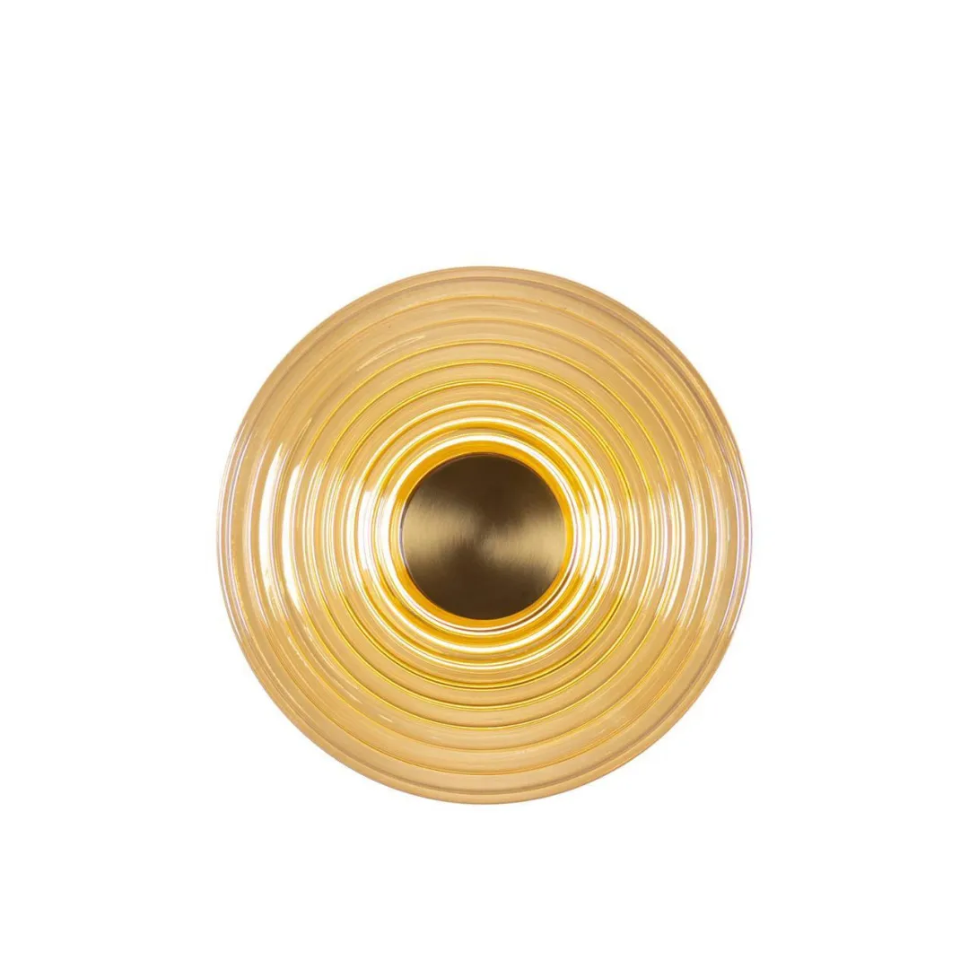 Металлический каркас цвета латуни, плафоны выполнены из стекла янтарного цвета с объемной структурой колец, встроенный LEDмодуль, регулируемая высота.