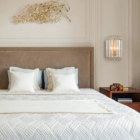 Angelica - нежная, романтичная и великолепная коллекция светильников, в которой сочетаются блеск и изысканность. Прозрачная тонкость искрящегося стекла подчеркивается нежным золотом каркаса - будто в светильнике играют воздушные пузырьки шампанского, переливаясь на свету.  Angelica is a gentle, romantic and magnificent collection of lighting fixtures, which combines radiance and refinement. The transparent thinness of the sparkling glass is emphasized by the delicate gold frame – as if champagne air bubbles sparkle in the lighting fixture, shimmering in the light.