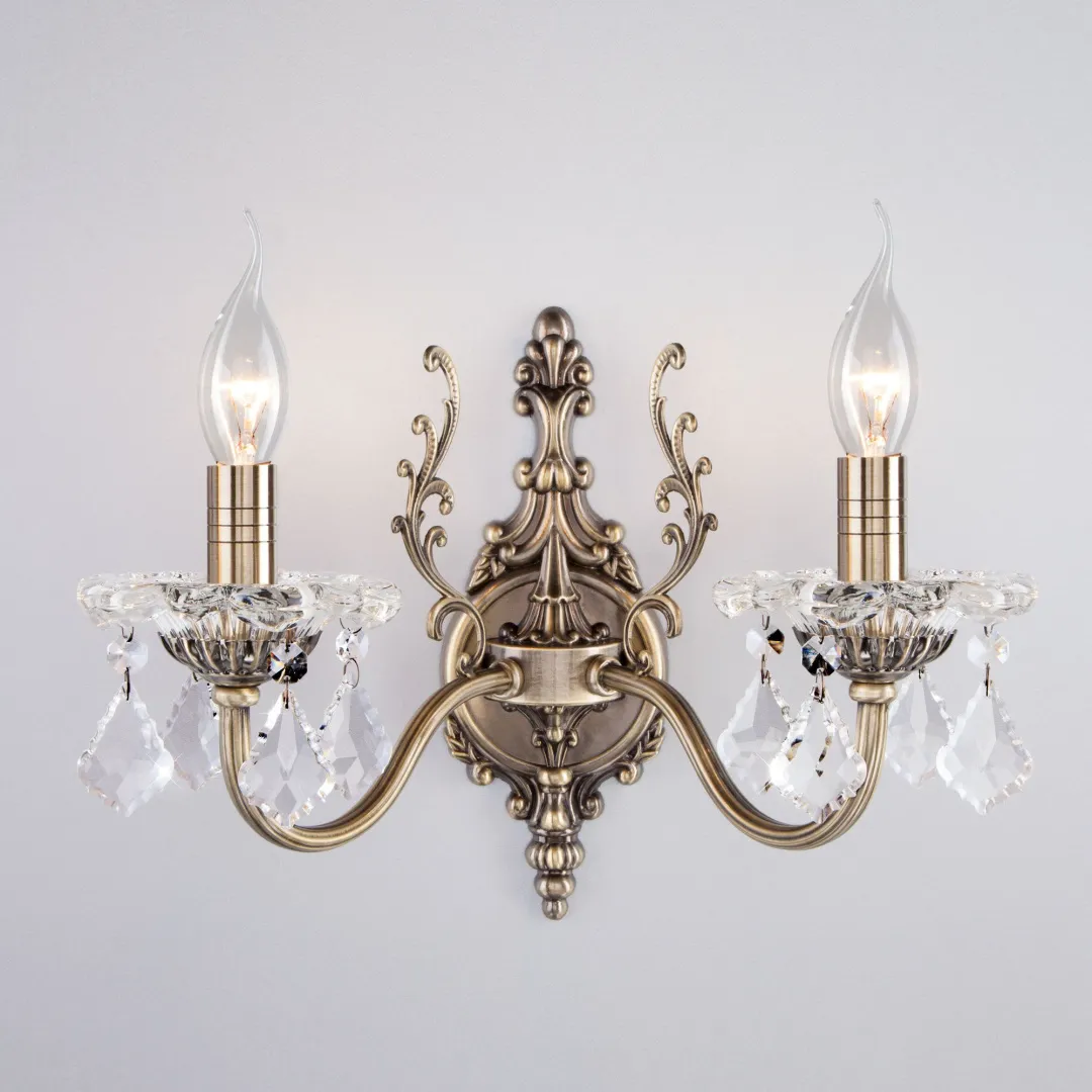 Бра с хрусталем 3281/2 античная бронза/прозрачный хрусталь Strotskis двухрожковый станет ярким световым акцентом в классических интерьерах и создаст качественное освещение на площади 10 м². Эффектные чаши подсвечников украшены хрустальными подвесками, которые искрятся в лучах света, наполняя помещение выразительным блеском. В качестве источника света используются сменные лампы типа свеча на ветру с цоколем E14. Патрон рассчитан на максимальную мощность ламп накаливания 60 Вт.