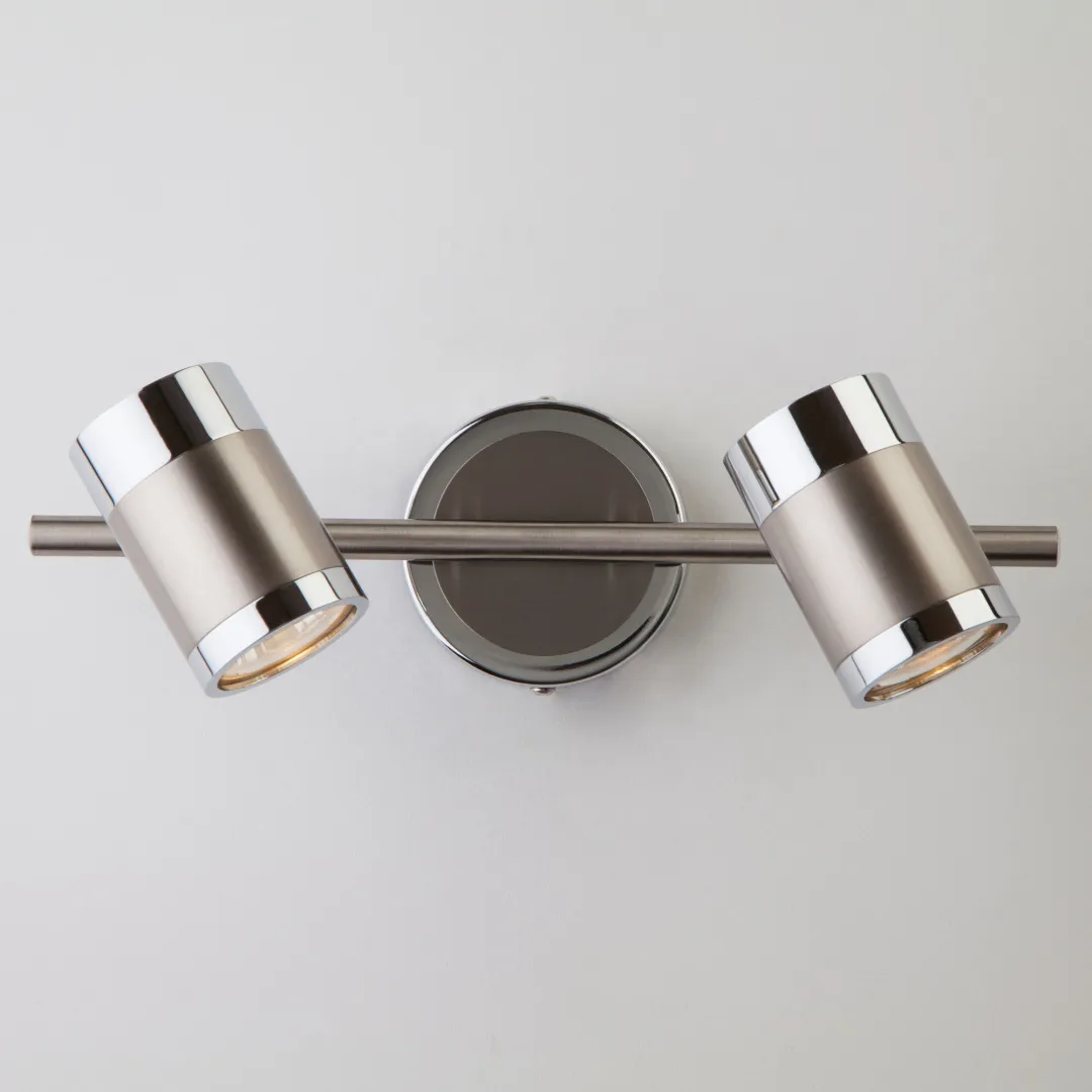 Настенный светильник с поворотными плафонами коллекции Prime создаст качественное дополнительное освещение и станет ярким дополнением к основному источнику света. Благодаря поворотным металлическим плафонам можно направлять свет в нужную зону, создавая акценты или равномерное освещение. В качестве источника света используются сменные лампы с цоколем GU10. Патрон рассчитан на максимальную мощность ламп накаливания 50 Вт.