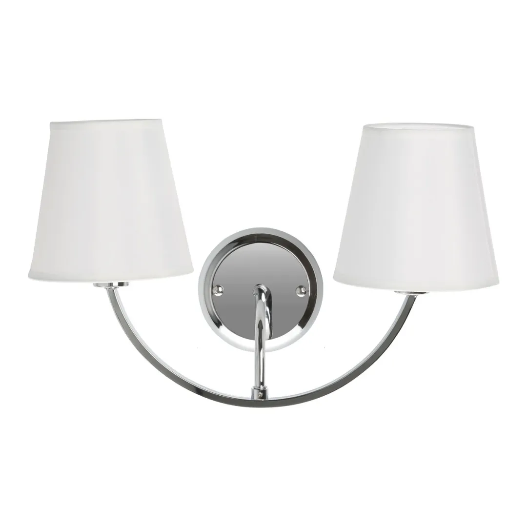 Металлическое основание настенного бра гальванизировано в цвет хрома. Вертикальное бра декорировано двухслойными текстильными абажурами белого цвета с термостойким акрилом внутри. Абажуры отделаны кантами сверху и снизу и прошиты.