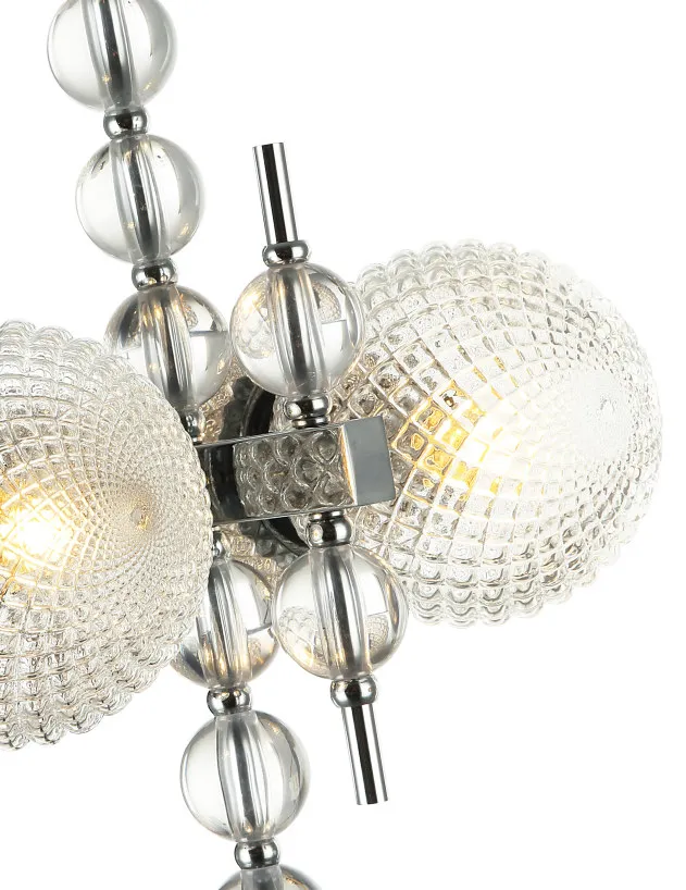 Светильник настенный из коллекции Queenly выполнен из металла, гальванизированного в цвет хрома, и декорирован сферами из прозрачного стекла и плафонами из фактурного прозрачного стекла. Светильник настенный коллекции выглядит стильно и респектабельно. Премиальное качество и неповторимыи? дизаи?н светильников идеально подои?дут в современные и дизайнерские интерьеры.