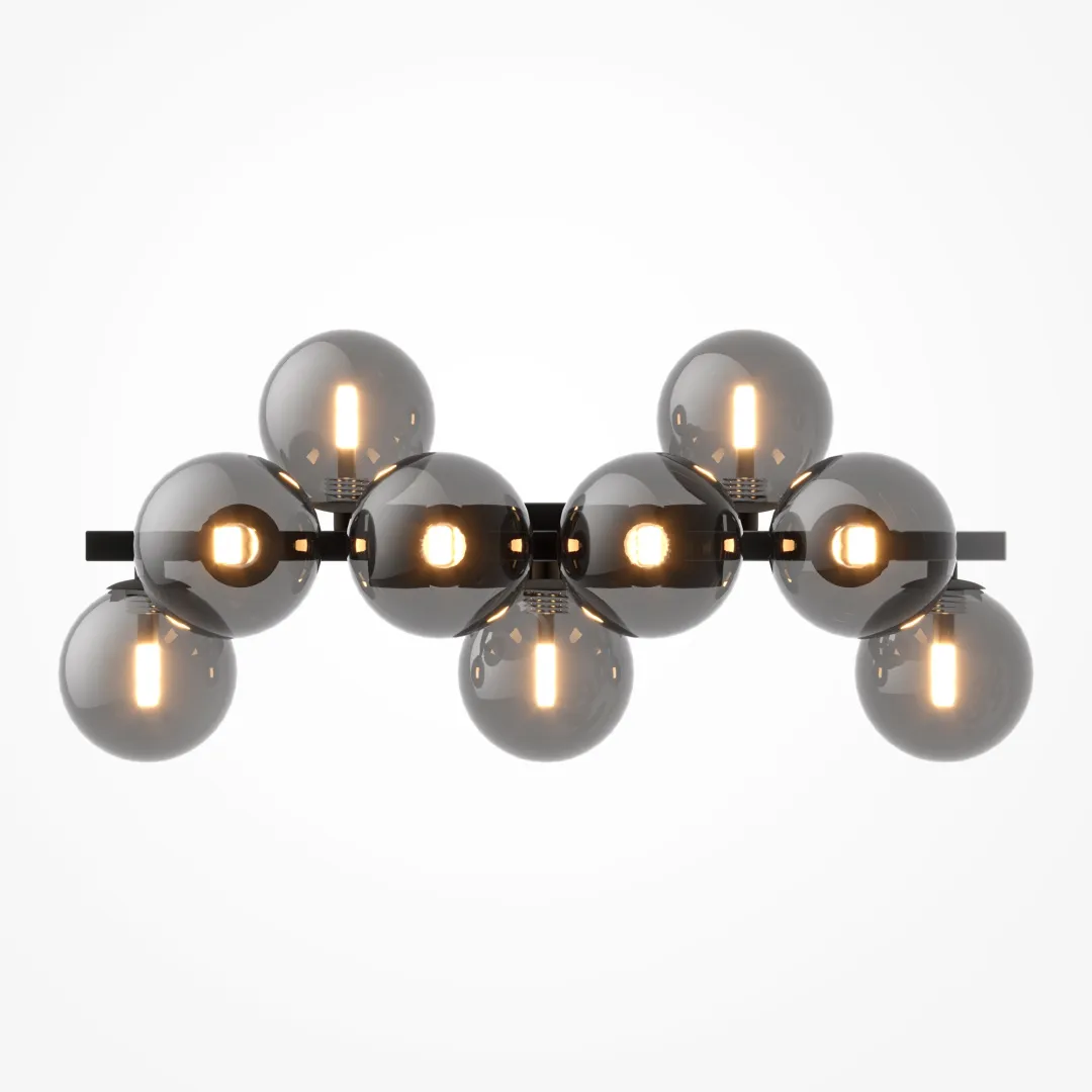 Масштабные скульптурные композиции, образованные многочисленными шарами из выдувного стекла, формируют неповторимый облик светильников серии. На полированных металлических ветвях установлены тонированные плафоны, которые мягко рассеивают и приглушают свет ламп. Модели серии представлены в трех цветах: золото, хром и латунь. Высота подвесных светильников регулируется длиной троса. Серия представлена потолочными, подвесными светильниками, и бра.