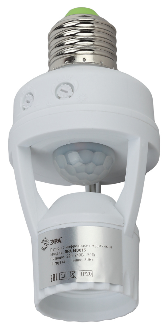 Простое устройство для экономии электроэнергии. В датчик-патрон вкручивается лампа с цоколем Е27, затем датчик с лампой вкручивается в стандартный патрон. Максимальное удобство в использовании и никаких дополнительных электромонтажных работ. Инфракрасный датчик-патрон MD15 от ЭРА имеет угол обзора 360 градусов и улавливает движение на расстоянии 6 метров. Вкрученная в него лампа автоматически включается, когда вы входите в помещение, и выключается, когда вы покидаете комнату. Больше не нужно подолгу нащупывать в темноте выключатель или ругать домочадцев за то, что забыли выключить свет. Датчик-патрон ЭРА сделает всё за вас! Инфракрасный датчик - самый распространённый и безопасный тип датчиков. Он улавливает инфракрасные волны, свойственные всем теплокровным существам: человеку или животным. Свет в помещении будет только в те минуты, когда вам это нужно. Так можно сэкономить до 80% электроэнергии.