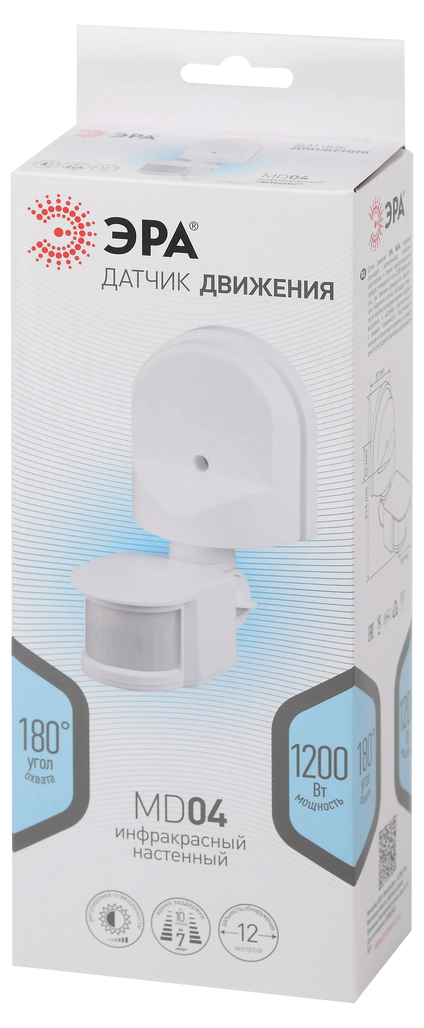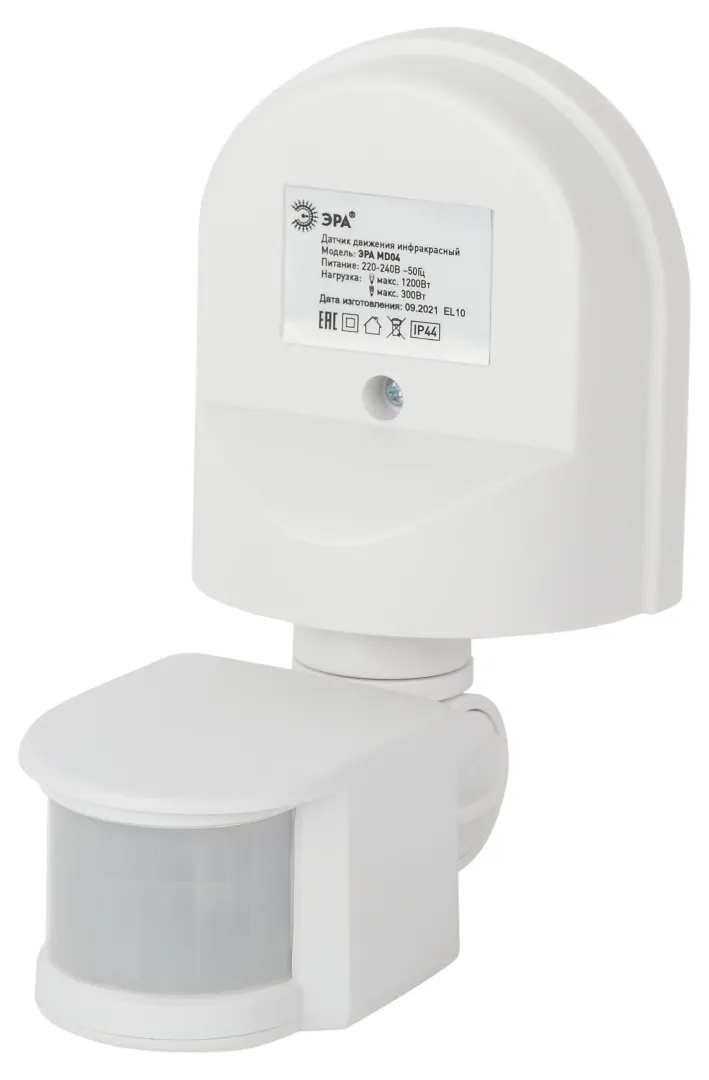 ЭРА MD 04 Датчик движения настенный позволяет производить автоматическое включение осветительных приборов, питающихся от сети 220 В, при появлении движущегося объекта в зоне обнаружения датчика. Благодаря этому , а также наличию регулировки времени задержки выключения и настройки чувствительности к внешней освещенности, обеспечивается экономия не только вашего времени, но и денег за счет разумной Экономии электроэнергии.