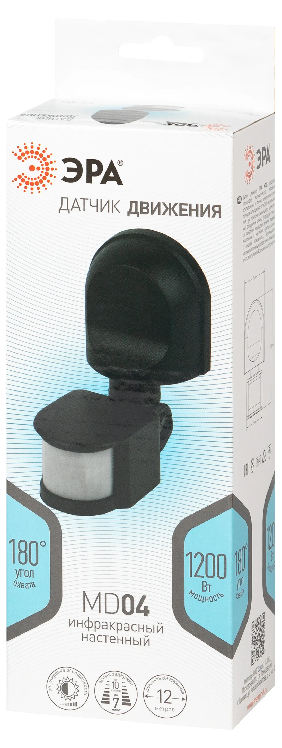 ЭРА MD 04 Датчик движения настенный позволяет производить автоматическое включение осветительных приборов, питающихся от сети 220 В, при появлении движущегося объекта в зоне обнаружения датчика. Благодаря этому , а также наличию регулировки времени задержки выключения и настройки чувствительности к внешней освещенности, обеспечивается экономия не только вашего времени, но и денег за счет разумной Экономии электроэнергии.