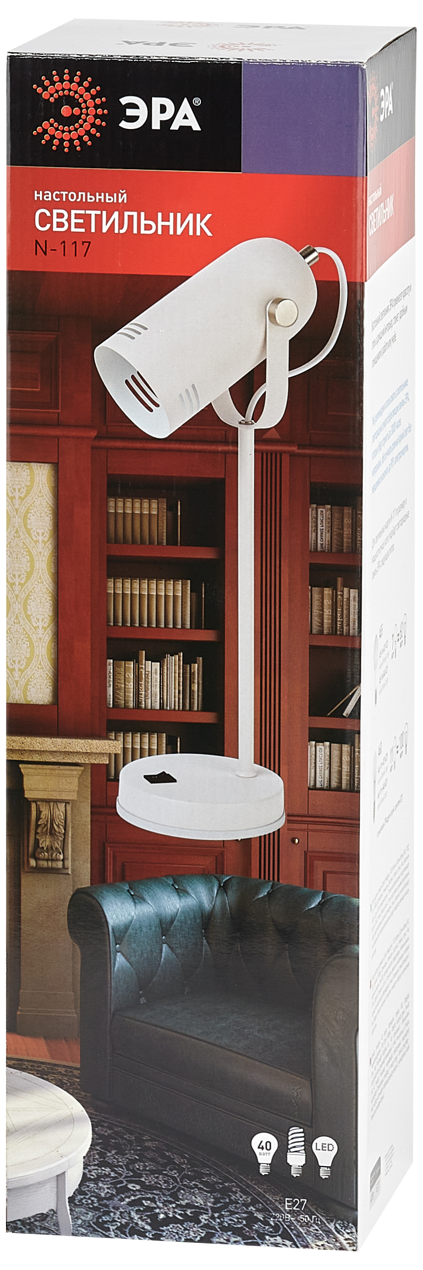 Красивый и удобный настольный светильник ЭРА N-117-Е27-40W-W в стильном "ретро" корпусе. Может использоваться с разными источниками света - лампой накаливания, компактной люминесцентной лампой (КЛЛ) или светодиодной (LED) лампой. Прочный металлический корпус украшен гальванизированными элементами. Подвижный плафон позволяет регулировать направление света. В числе преимуществ для комфортного использования - устойчивость конструкции и оптимальные размеры для размещения на столе. Трендовый дизайн и актуальное сочетание цветов (белый корпус с матовыми серебристыми деталями) сделают этот светильник изюминкой интерьеров, особенно в стиле лофт или минимализм.