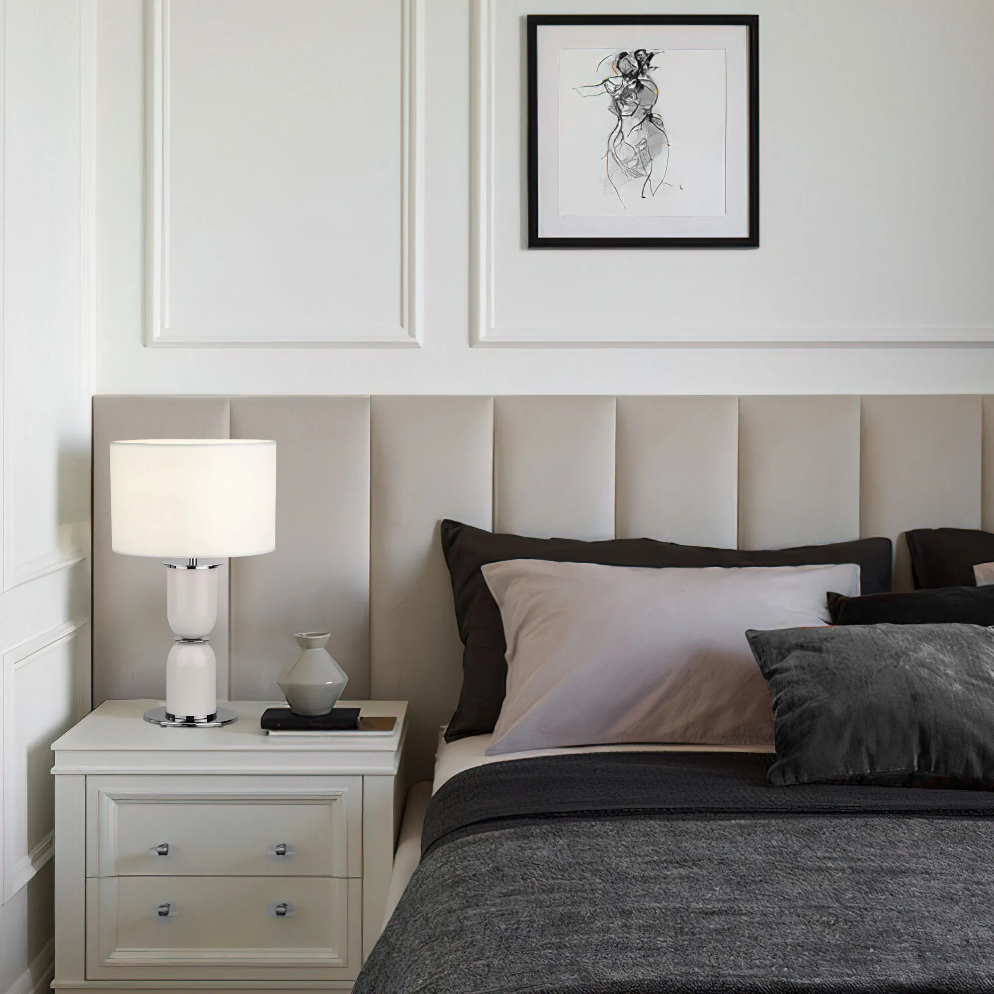 Благодаря белому тканевому абажуру настольная лампа создает мягкое рассеянное свечение, подходящее для комфортного чтения книг в вечернее время. Прочный металлический корпус светильника устойчив к механическим воздействиям, а защитное покрытие обеспечивает надежную электроизоляцию и презентабельный внешний вид.