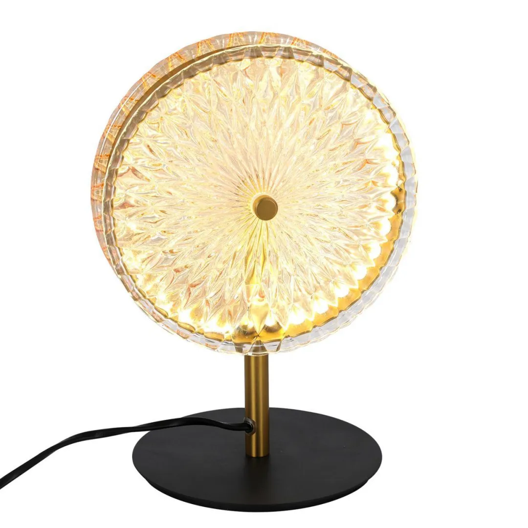 Каркас черного цвета, плафон состоит из двух узорных стеклянных дисков прозрачного и янтарного цвета, внутри которых расположен LEDмодуль, регулируемая высота.