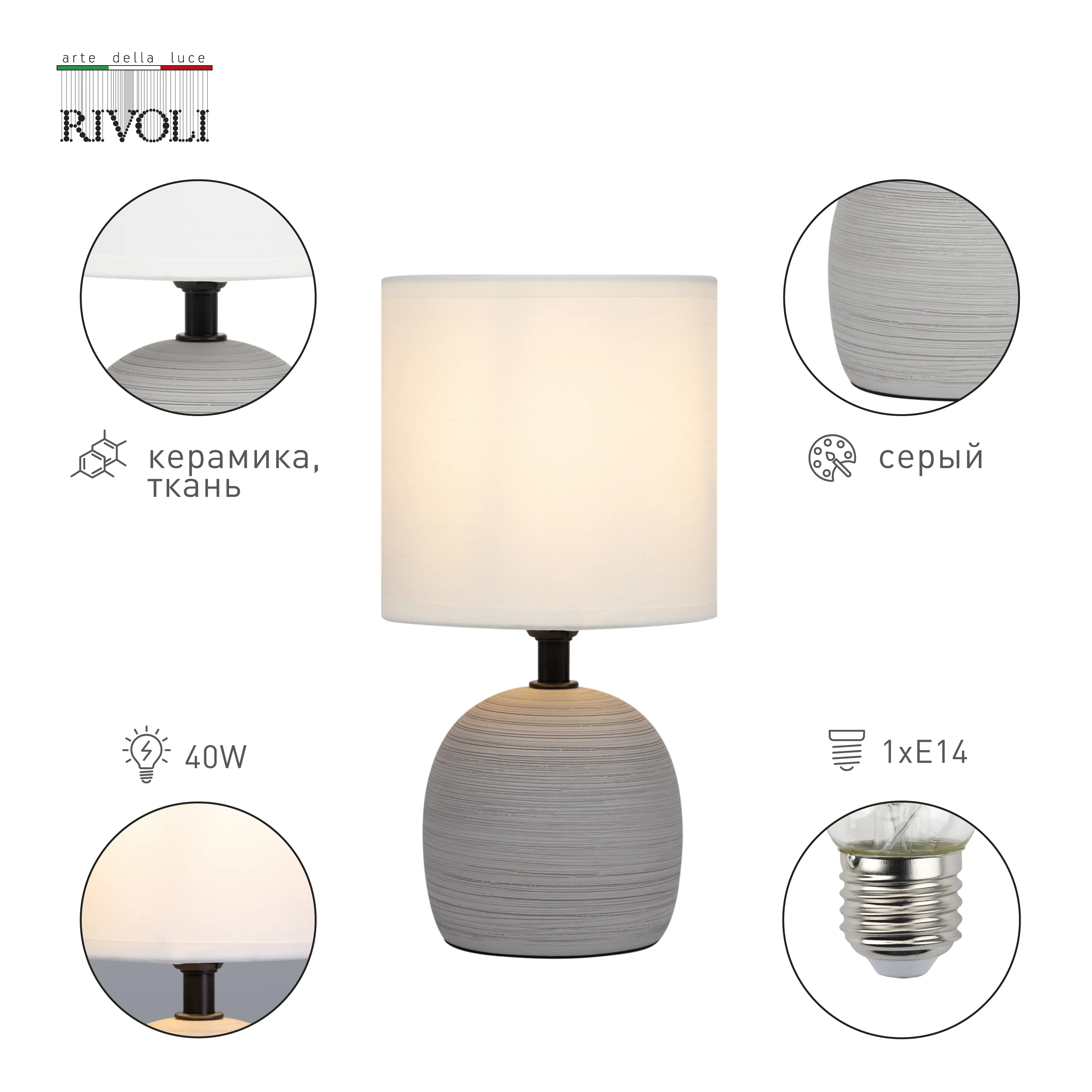 Настольная лампа Rivoli Sheron (арт. 7044-501) - красивое и практичное решение для вашего дома. Лампы настольные создают в помещении уют и комфортную атмосферу для отдыха. Данная лампа настольная от европейских дизайнеров имеет классический белый абажур из качественной ткани. Цвет настольной лампы Sheron - один из самых популярных в современном дизайне интерьеров. Светло-серые оттенки лампы на стол выглядят лаконично и интеллигентно, такие лампы настольные не потеряют своей актуальности спустя годы.