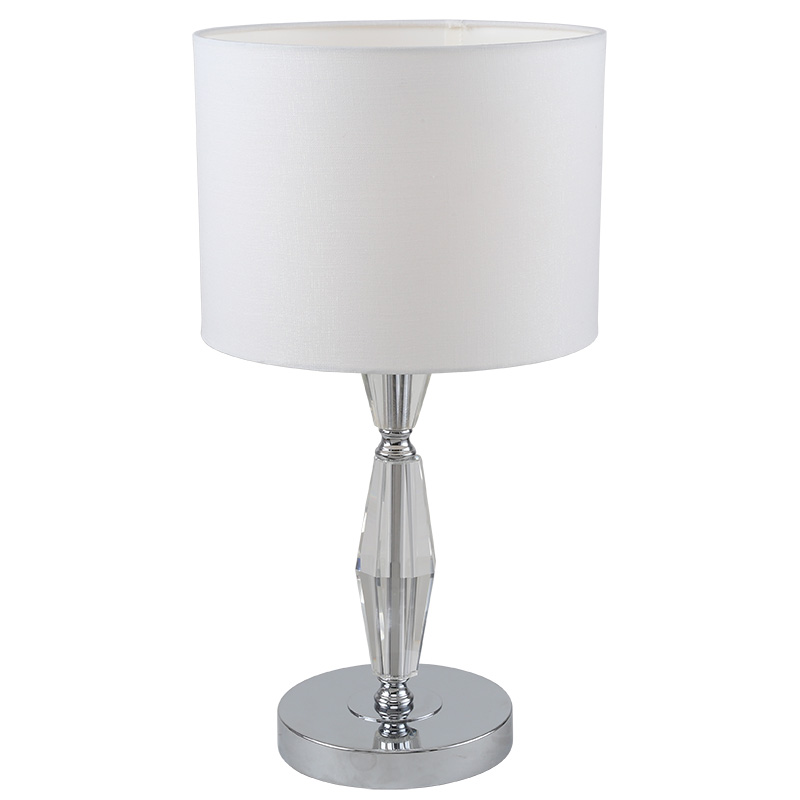 Светильник настольный из коллекции Estetio выполнен из металла, гальванизированного в цвет хрома, и декорирован прозрачным массивом хрусталя. Текстильный абажур белого цвета с термостойким акрилом внутри создает мягкий рассеянный свет. Премиальное качество и неповторимыи? дизаи?н светильников идеально подои?дут как в классические, так и современные интерьеры.