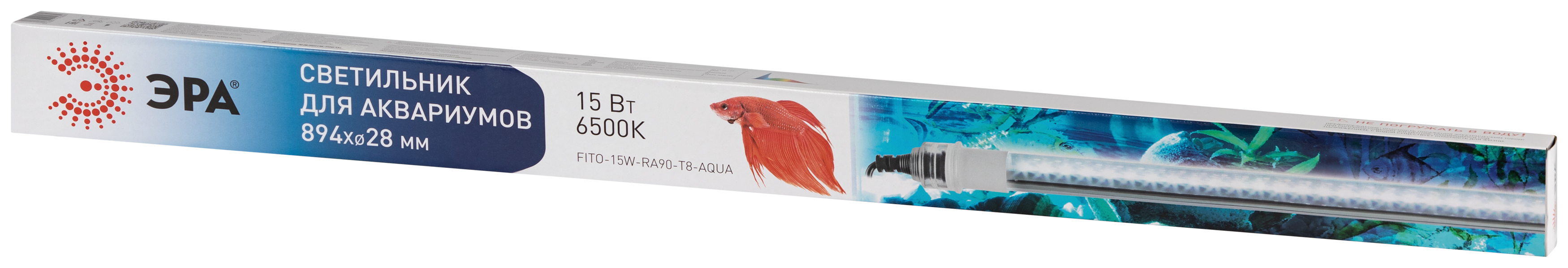 Лампа для аквариума ЭРА FITO-10W-Ra90-Т8-AQUA длиной 884 мм и мощностью 15 Вт, с патронами IP65 и проводом подключения. Готовый комплект для того, чтобы придать аквариуму эстетичный и стильный внешний вид, поддержать развитие аквариумной биосистемы. Кристально чистая вода и эффектная подсветка!