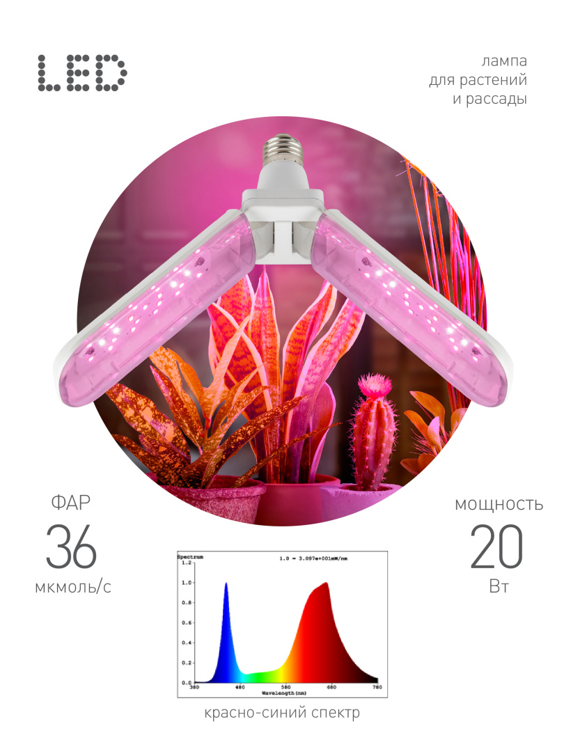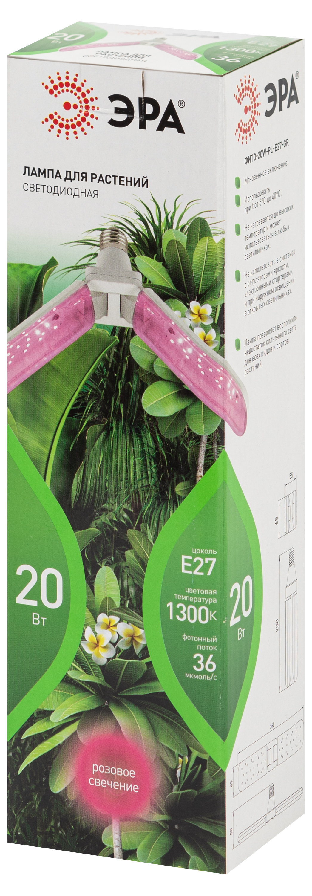 2-лепестковая фитолампа ЭРА Green Line красно-синего спектра. Мощность — 20 Вт, площадь досвечивания составляет 0,5 м2. Лепестковые фитолампы с удлинёнными плафонами, меняющими угол наклона, завоевали большую популярность у растениеводов. Они эстетично выглядят и удобны в применении. Правильно выбранный угол наклона позволяет эффективно досвечивать растения, грамотно направляя световые потоки.