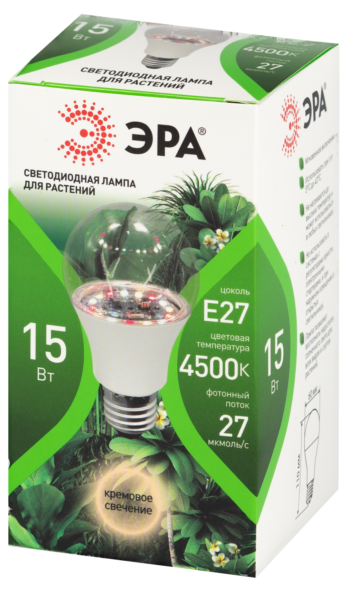 Полноспектральная фитолампа 15 Вт новой линейки бытового фитоосвещения ЭРА Green Line, которая объединила в себе все базовые фитопродукты для выращивания растений в домашних условиях. В линейке представлены как экстрапопулярные лепестковые лампы, так и мощные лампы POWER, лампы с колбами А60, А65. Расширен ассортимент фитоламп с цоколем E27.
