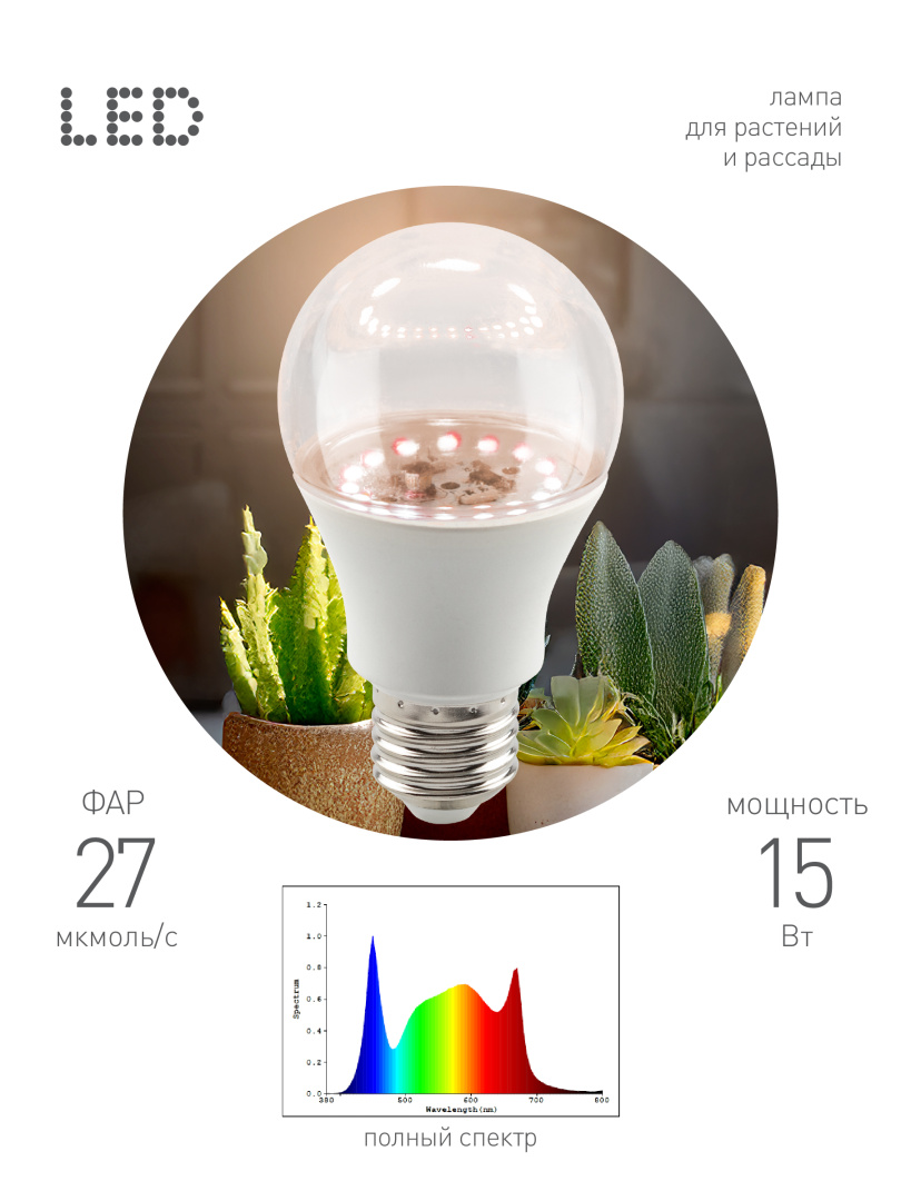 Форма данной фитолампы как у обычной лампы накаливания. Тип цоколя — самый популярный: Е27. Специальный спектр света делает комнатные растения здоровыми и позволяет им быстрее расти. Фитолампа подходит и для эффективного выращивания рассады. Бледно-розовое освещение комфортно для глаз человека и домашних питомцев.