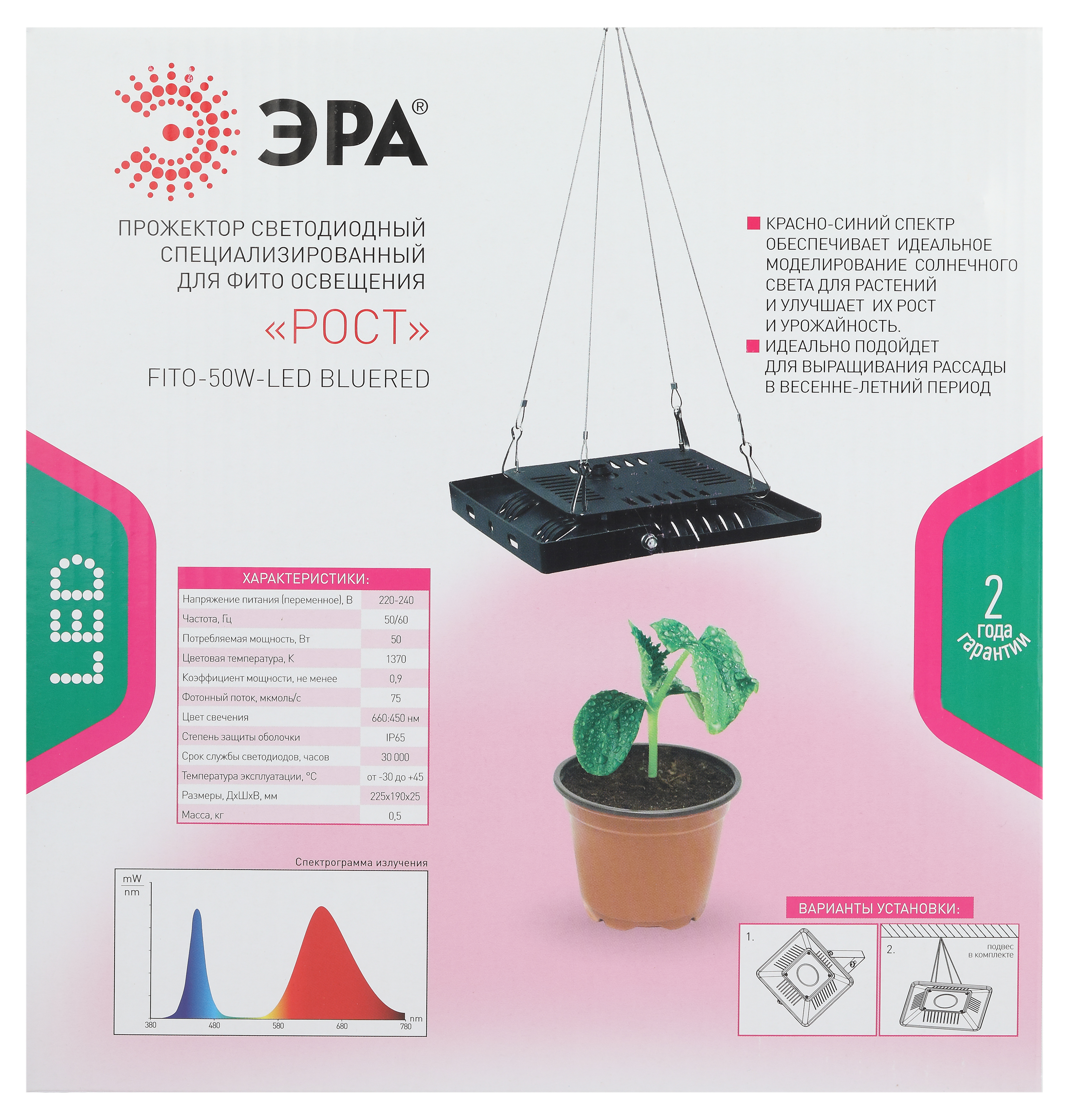 Светодиодный прожектор ЭРА FITO-50W-LED BLUERED предназначен для выращивания растений в теплицах и оранжереях на всех стадиях: рассады, цветения, плодоношения. Главной особенностью фитолампы является красно-синий спектр излучения. Он заботится об увеличении урожая и быстром росте растений. По сравнению с белым светом красно-синий увеличивает эффективность поглощения в несколько раз. Прожектор защищен от пыли и влаги: поливайте рассаду и не думайте о поломке. За счет светодиодов светильник для растений значительно экономит расход электроэнергии. Прожектор можно использовать в широком диапазоне температур: от -30 до +45 градусов; прорезиненный провод выдерживает морозы. Он легко крепится на встроенный кронштейн или специальный подвес, который идет в комплекте. За счет светового потока в 75 мкмоль его можно устанавливать на высоте до 2,5 м над рассадой. Создайте для любимых растений комфортные условия, а себя обеспечьте большим урожаем вместе с фитопрожектором ЭРА!