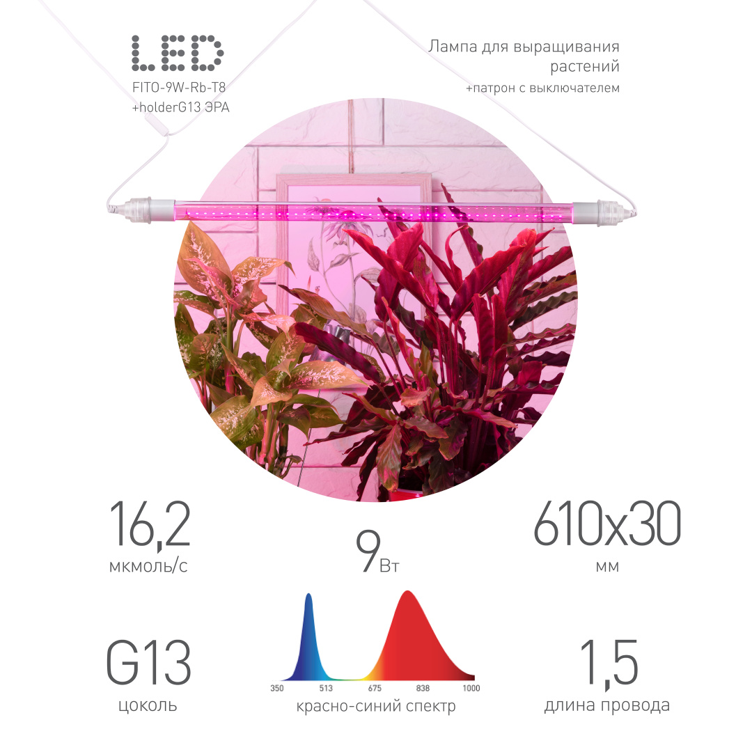 Линейный фито светильник FITO-9W-RB-Т8+holderG13, красно-синего спектра IP 65 c выключателем и вилкой позволит без дополнительных усилий подключить лампу T8 и разместить ее в любом удобном для вас месте. Белый цвет удачно впишется в любой интерьер, а компактный размер не займет много места. от компании ЭРА необходимая вещь для Ваших растений. Она позволит Вам не только красиво оформить интерьер дома цветами, но и собрать небольшой урожай! Подойдет для зелени, капусты, а также некоторых видов пасленовых. 46 светодиодов с направленным фиолетовым светом ускоряют процесс фотосинтеза. Прозрачное светопроницаемое стекло эффективно воздействует на рассаду. Фитолампа рекомендована для эксплуатации в помещениях с естественным светом и обычными лампами 1200 К. Небольшие габариты: длина 60 см, диаметр колбы - 2,6см, длина шнура питания - 1,5 м позволяют разместить ее в комнате небольшой площади. Идеальна для вертикального выращивания. Площадь освещения составляет 0,7 м2. Линейный фито светильник FITO-9W-RB-Т8+holderG13 безопасен для человека. Коэффициент пульсаций в 5% снижает риск воздействия на глаза. Цветовая температура в 1200 К подарит приятное свечение. Лампа ЭРА залог красивых цветов и спелого урожая!