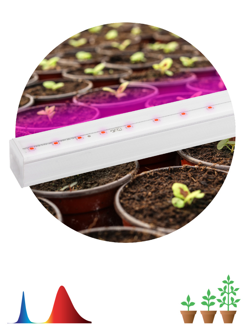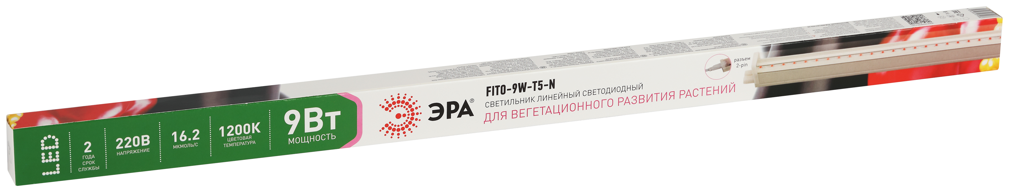 ЭРА FITO-9W-Т5-N — фитосветильник ЭРА красно-синего спектра особенно эффективен для вегетационного развития растений. Имеет удобную для подоконников и теплиц удлинённую форму корпуса, из нескольких таких светильников можно собирать единые цепи фитоосвещения, включающие до 14 штук одновременно.
