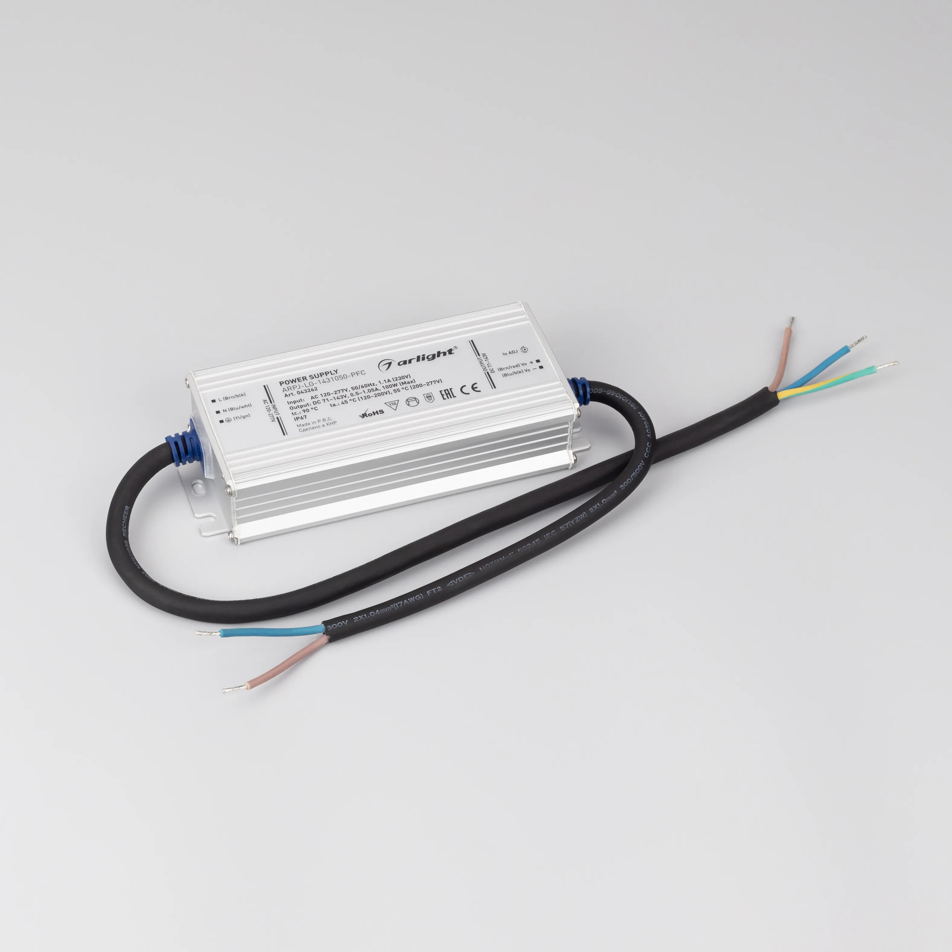 Регулируемый источник тока с гальванической развязкой для светильников и мощных светодиодов. Входное напряжение 120-277 VAC. Выходные параметры: 71-143 В, 500-1050mА (регулировка встроенным потенциометром, установка по умолчанию 700мА), 100 Вт. Встроенный PFC >0.95. Герметичный металлический корпус IP 67. Габаритные размеры длина 153 мм, ширина 63 мм, высота 32 мм. Гарантийный срок 5 лет.