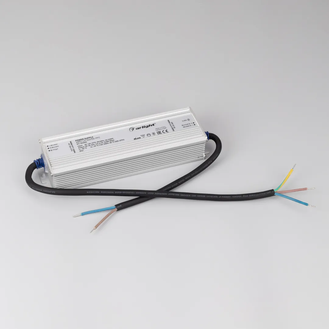 Источник тока с гальванической развязкой для светильников и мощных светодиодов. Входное напряжение 120-277 VAC. Выходные параметры: 25-56 В, 3500-6700mА (регулировка встроенным потенциометром, установка по умолчанию 5500мА), 240 Вт. Встроенный PFC >0.95. Герметичный металлический корпус IP 67. Габаритные размеры длина 217 мм, ширина 63 мм, высота 37 мм. Гарантийный срок 5 лет.