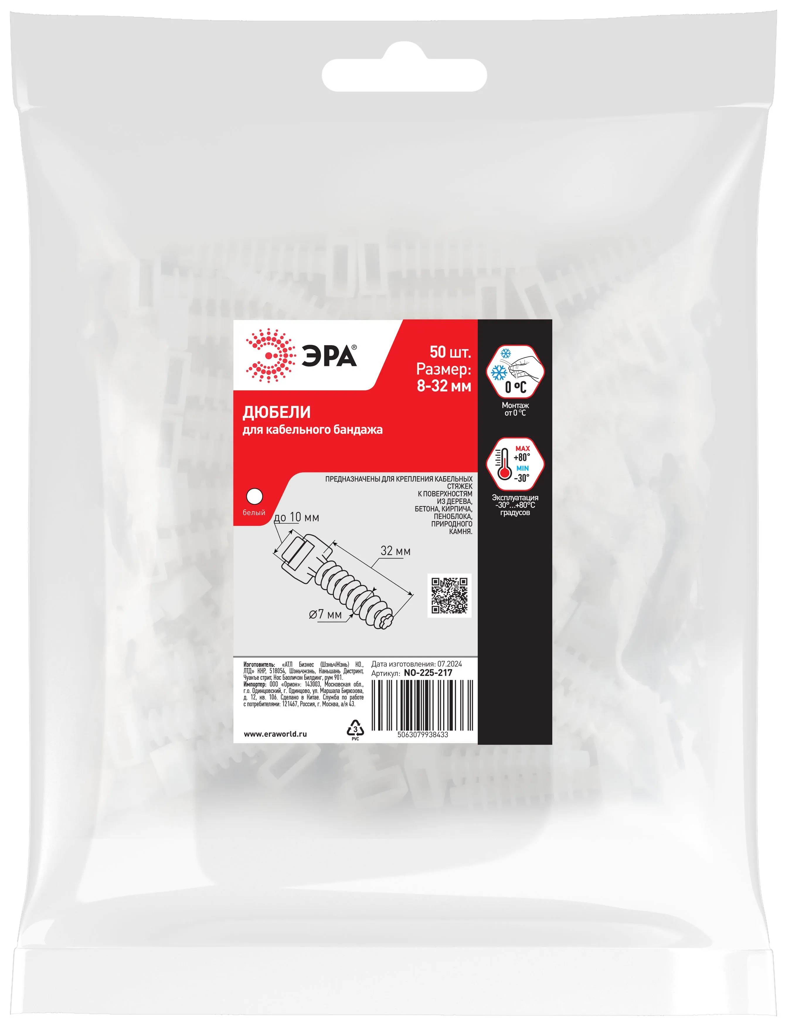 Дюбели для кабельного бандажа ЭРА применяется при монтаже кабельных трасс хомутами к поверхностям стен и потолка на бетонных, кирпичных и деревянных поверхностях. Специально для стяжки на головке дюбеля предусмотрено отверстие, в которое крепится кабельная сятжка.