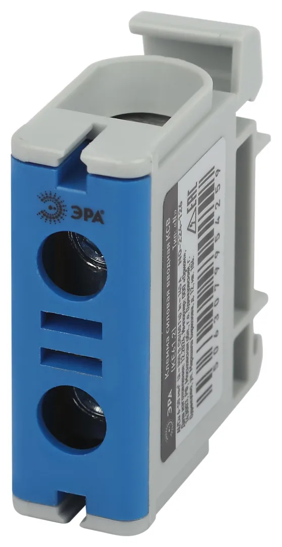 Клеммы силовые вводные КСВ ЭРА представляют собой клеммный винтовой зажим из алюминия в компактном корпусе из диэлектрического негорючего пластика. Предназначены для организации ввода и распределения проводников больших сечений (от 6 до 240 мм²) внутри электротехнических шкафов и щитов, а также в качестве переходного элемента при соединении проводников, дополнительных элементов для подключения и установки промышленного оборудования в цепях переменного или постоянного тока напряжением до 800 В. Клеммы силовые вводные КСВ находят своё применение в любых электротехнических установках, начиная от низковольтного распределительного и контрольного промышленного оборудования и заканчивая системами автоматизации зданий. Применение клемм КСВ позволяет: - организовать упорядоченный ввод и распределение в НКУ, - сократить количество проводников в НКУ, что упрощает его обслуживание, - сэкономить пространство и без особых усилий размещать новые элементы. Особенности конструкции: - универсальная конструкция крепления позволяет проводить монтаж клемм как на DIN-рейку, так и на монтажную панель. - токоведущая часть выполнена из алюминия, обладает ребристой поверхностью на внутренней части, что обеспечивает надёжную фиксацию при затягивании контакта, - прижимные винты с шестигранной головкой изготовлены из оцинкованной стали и обладают скруглённой контактной частью, что исключает перекусывание и повреждение подключаемых проводников. - материал изолированного корпуса: не горючий полиамид 6.6 с добавлением антипиренов (класс горючести V-0 по UL 94). - перегородка по середине клеммы позволяет разделят подходящий и отходящий проводники, - клеммы для фазных, нейтральный и заземляющих проводников имеют соответствующую цветовую индикацию, что облегчает их идентификацию внутри щита, - на передней крышке клемм предусмотрено крепление для маркировочных бирок, которые приобретаются отдельно.