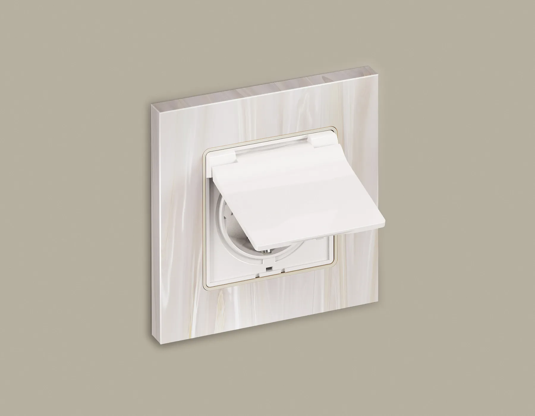 Лицевая панель ALFA для электрической розетки с заземлением со шторками и защитной крышкой IP44 QUANTAP1080