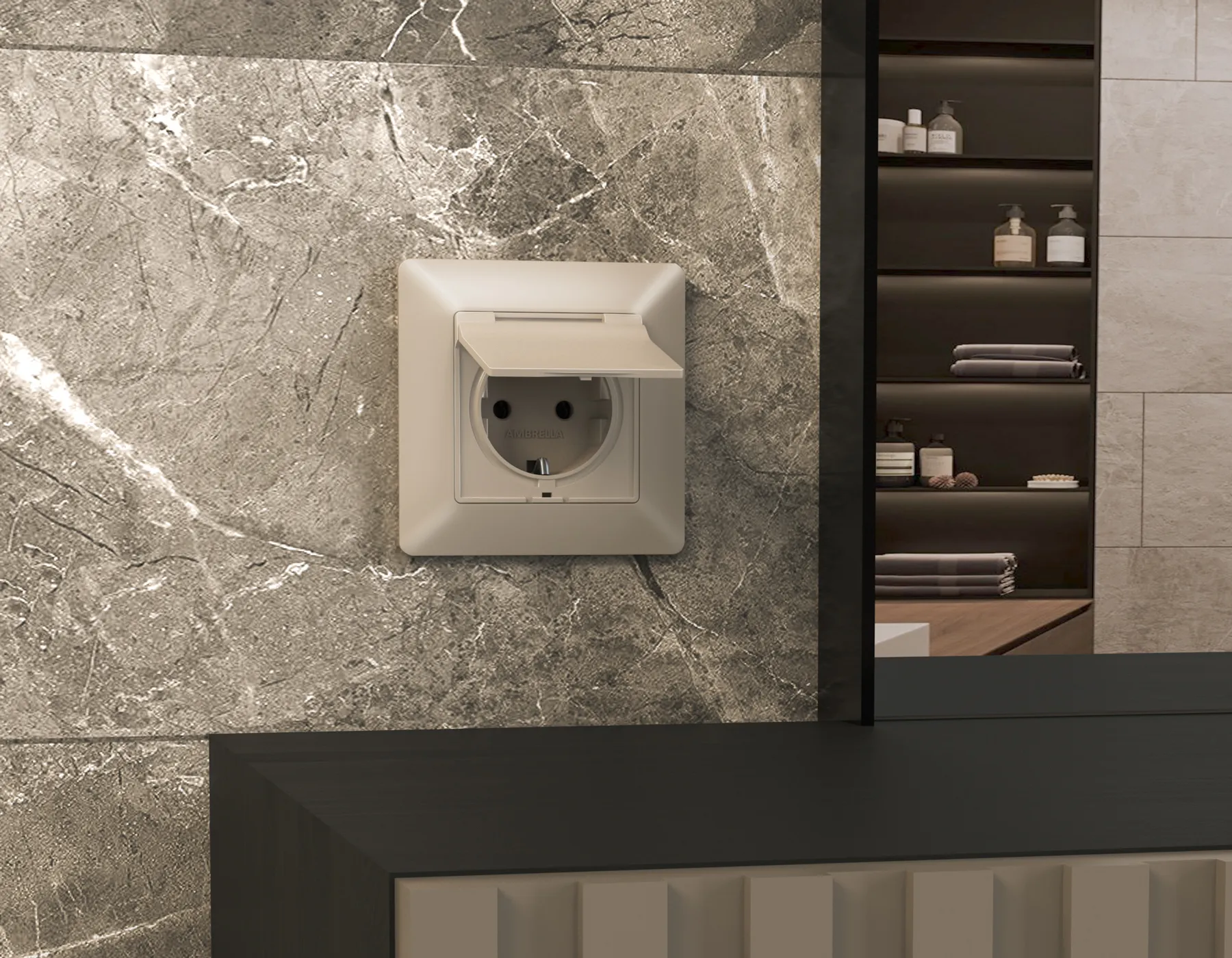 Лицевая панель ALFA для электрической розетки с заземлением со шторками и защитной крышкой IP44 QUANTAP3680