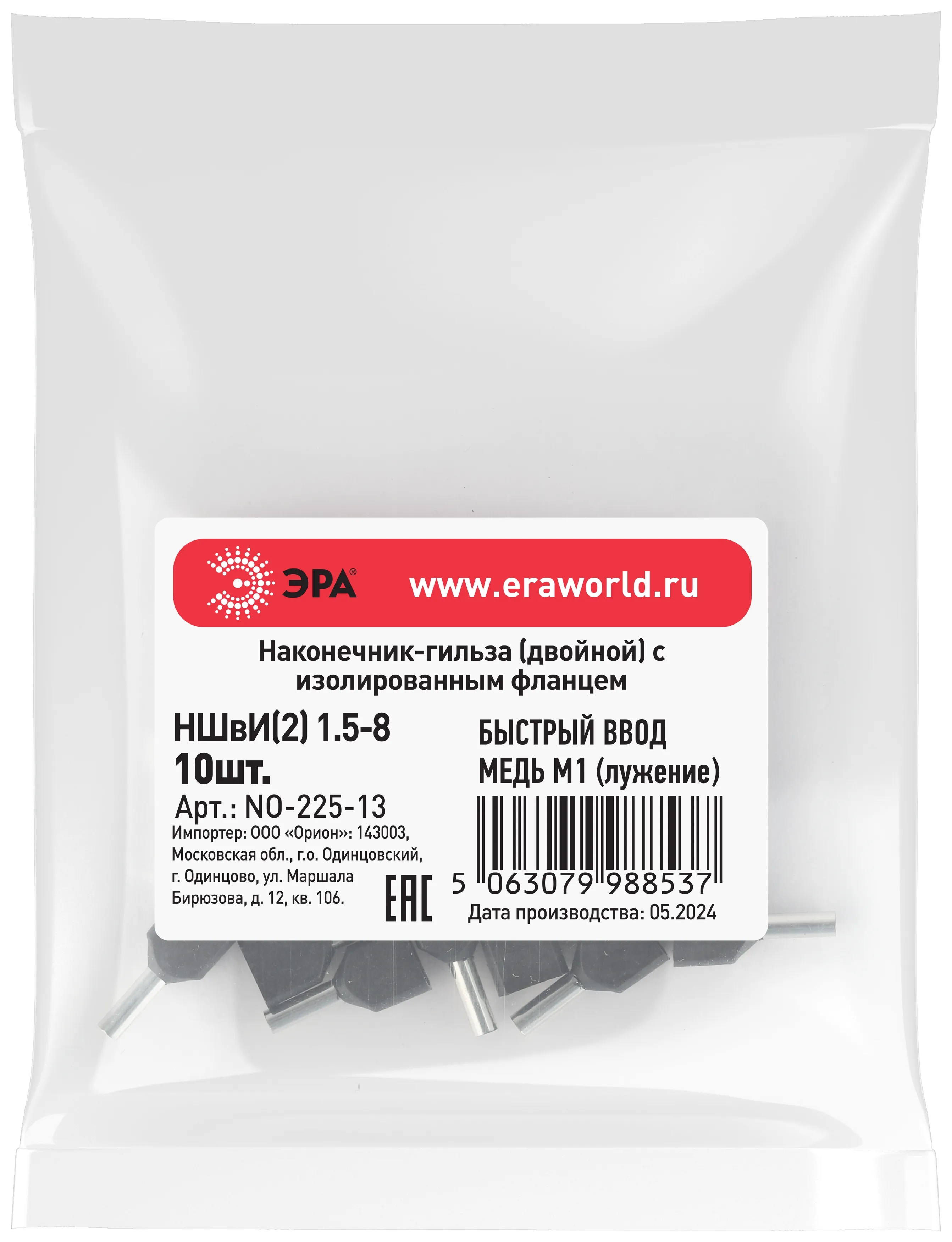 Наконечники-гильзы НШвИ(2) двойные состоят из медной луженой гильзы, один конец которой развальцован для облегчения ввода многожильного провода и изолирующей манжеты из полипропилена. Предназначены для использования с двумя проводниками: для оконцевания гибких многопроволочных медных проводников методом опрессовки для последующей фиксации в клемме или нулевой шине. Заменяют обязательный процесс облуживания многопроволочных медных проводов (типа ПВ-3, ПВС и т. п.). Применяются при сборке и монтаже электрощитового оборудования, щитов управления, квартирных или офисных распределительных щитков, при подключении к нулевым шинам. Наконечники-гильзы представлены в двух исполнениях для использования с одним и двумя проводниками. Особенности конструкции: • Коническая форма внутренней части манжеты облегчает заведение гибкого многопроволочного проводника в наконечник, т.к. изготовлена по технологии «Easy-Entry»/«Быстрый ввод». • Изолирующая манжета служит ограничителем и одновременно дополнительно фиксирует провод по изоляции, предотвращая его излом. • Цветовая маркировка изолирующих манжет выполнена в соответствии с DIN 46228 часть 4, позволяет быстро подобрать нужный размер наконечника под сечение проводника. • Материал гильзы: медь марки М1, покрытая электролитическим лужением. • Материал манжеты: полипропилен с добавлением антипиренов, не поддерживающий горение.