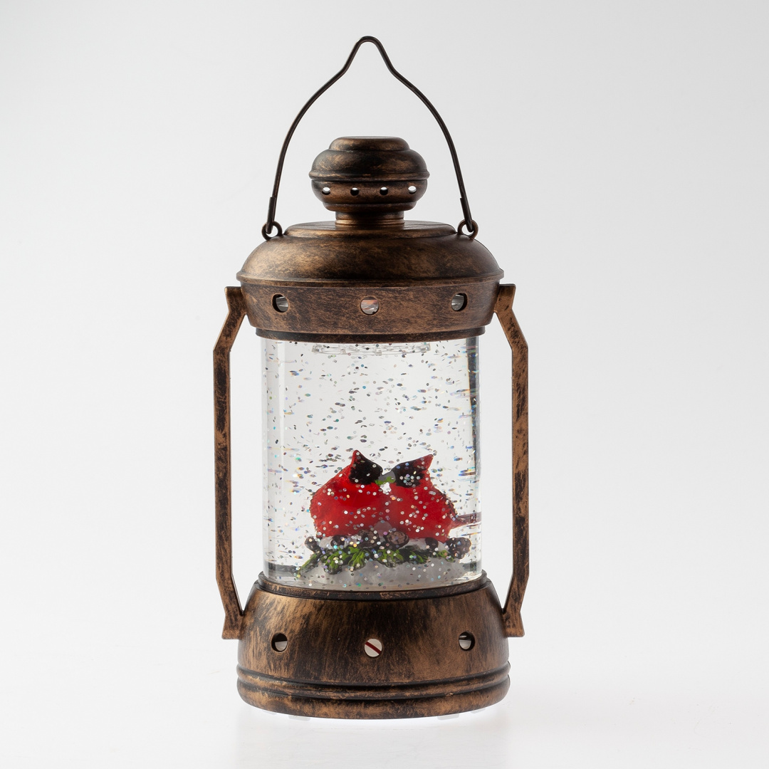 Новогодний светодиодный светильник ЭРА ENGDS-12 "Красный кардинал" высотой 18 см (арт. Б0051944) создаст у Вас дома праздничную атмосферу! Светильник-фонарик выполнен из ПВХ и окрашен под медь, внутри стекла расположены блестки, создающие эффект падающего снега. Внутри фонаря находятся фигурки двух красных кардиналов, они подсвечиваются 1 светодиодной лампочкой сверху. Декоративный светильник работает от 3 батареек АА, степень защиты IP20 (рекомендуется использовать в помещениях), автоматическое отключение через 6 часов. Он станет прекрасным украшением кухни, гостиной, а еще его можно использовать в спальне как ночник. Настольный винтажный фонарь - это необычный подарок на Новый год или Рождество, который понравится взрослым и детям. Новогодний декор для дома всегда поднимает настроение!