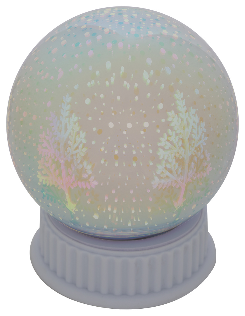 Праздничный светодиодный шар ЭРА ENGDS-14 "Новогодний лес" (арт. Б0051950) диаметром 13 см подарит теплую атмосферу вашему дому к Новому году и Рождеству! Шар выполнен из ПВХ и имеет внутреннюю проекцию елочек, которая в сочетании с холодной белой подсветкой создает ощущение глубины, шарик интересно разглядывать. Этот маленький настольный светильник станет оригинальным украшением для кухни, гостиной или спальни. Декоративный светильник работает от 3 батареек AAA и имеет класс защиты IP20 (использовать только в помещениях). Такой необычный декор для дома подарит вам ощущение праздника!