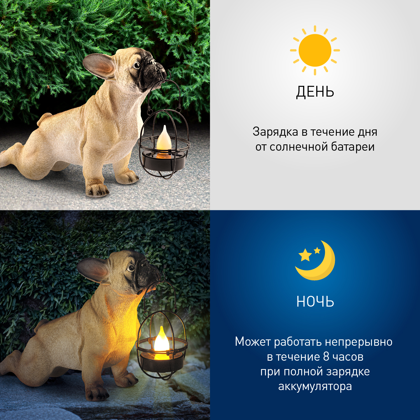 ЭРА ERASF22-04 (арт. Б0053353) - декоративный садовый светильник в виде забавного французского бульдога с ретрофонарём в зубах. Садовая фигура со встроенной светодиодной лампочкой выглядит очень реалистично и уютно подсвечивает сад вечером. Светильник садовый в форме собаки изготовлен из прочного полистоуна - искусственного камня с защитой от механических повреждений, осадков и ультрафиолета. Ландшафтный светильник с подсветкой отличается проработанными деталями, реалистичным дизайном и стойким окрашиванием в красивые естественные цвета. Тёплый цвет свечения LED-лампы настраивает на спокойный вечерний отдых. Встроенная солнечная батарея накапливает энергию в течение всего светового дня даже в пасмурную погоду.
