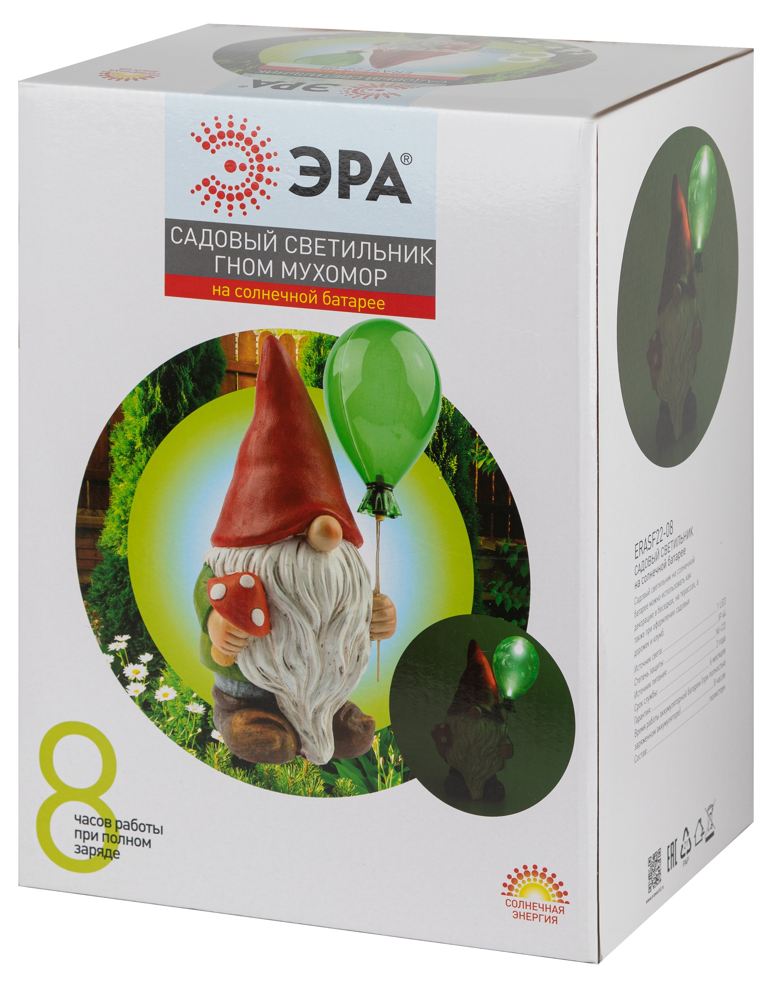 Фигурка садовая "Гном Мухомор" с шариком от компании ЭРА оживит пейзаж Вашего дачного участка! Этот уличный светодиодный светильник можно разместить в саду - в палисаднике, украсить беседку, веранду, кустарник, оригинально подсветить аллею или вход в дом. Садовый фонарь ERASF22-08 высотой 30 см выполнен из полистоуна и хорошо детализирован. Беспроводной светильник работает на солнечной батарее - этот тип получения энергии является самым экологичным, энергоемким, а также бесшумным. Питание происходит во включенном режиме в солнечную погоду, фигурка сама включается с наступлением ночи и работает до 8 часов. Зеленый шарик с подсветкой точно понравится и детям, и взрослым, и создаст неповторимую атмосферу праздника!