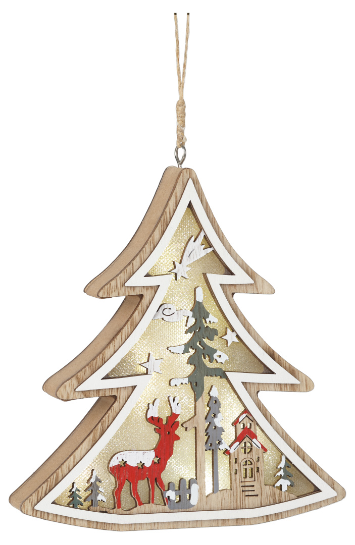 Светодиодная фигурка "Елочка" (арт. Б0056010) преобразит интерьер любого дома. Чтобы создать в своем доме настоящую атмосферу тепла, уюта и праздника, достаточно просто зажечь фигурку и пространство комнаты заиграет по-новому. 6 экономичных и долговечных светодиодных лампочек, встроенных в украшение, создают особое теплое белое свечение, не создающее дискомфорта для глаз. Высота украшения составляет 14 см, что позволяет не только подвесить его, но и использовать его как ночник в детской комнате - он безопасен и не издает никакого лишнего шума. Новогодний светильник питается от 3 батареек ААА и экономичен благодаря LED-лампам. Декоративный светильник украшен тематическими новогодними рисунками елок, заснеженной полянки, Деда Мороза и оленей - такой принт отлично подойдет для праздника. Купив новогоднее украшение ЭРА вы останетесь довольны и сможете создать праздничную атмосферу в доме!