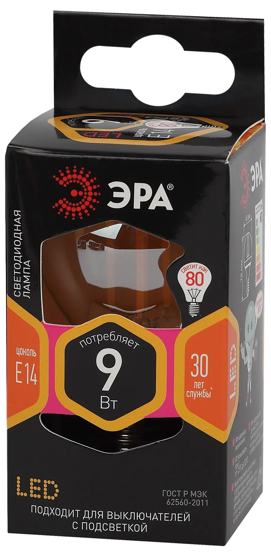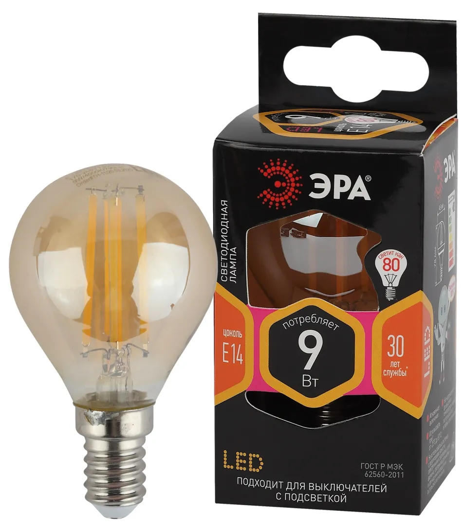 Лампочка светодиодная эра f-led p45-9w-827-e14 gold б0047022